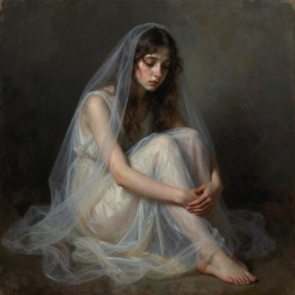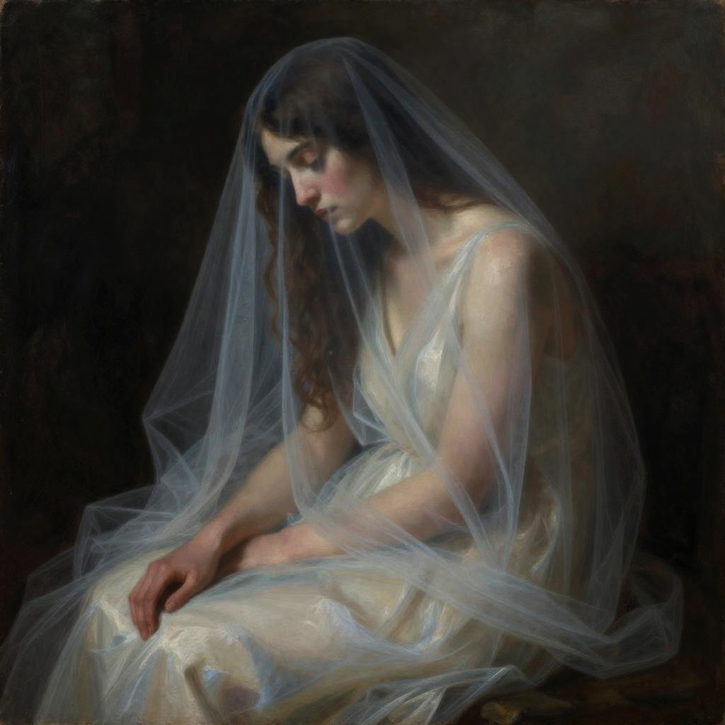 Realistic photo.loose painting of a melancholic, fragile, stunning veiled woman covered in translucent flowing dress, ethereal drapery, inspired by Raffaelo Monti, John Singer Sargent, Giovanni Strazza, alla prima technique realistic photo