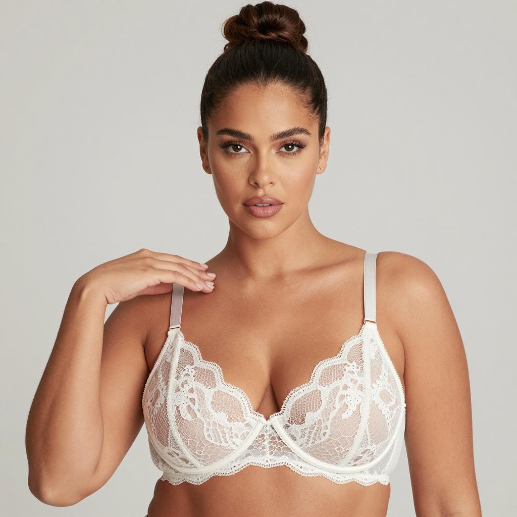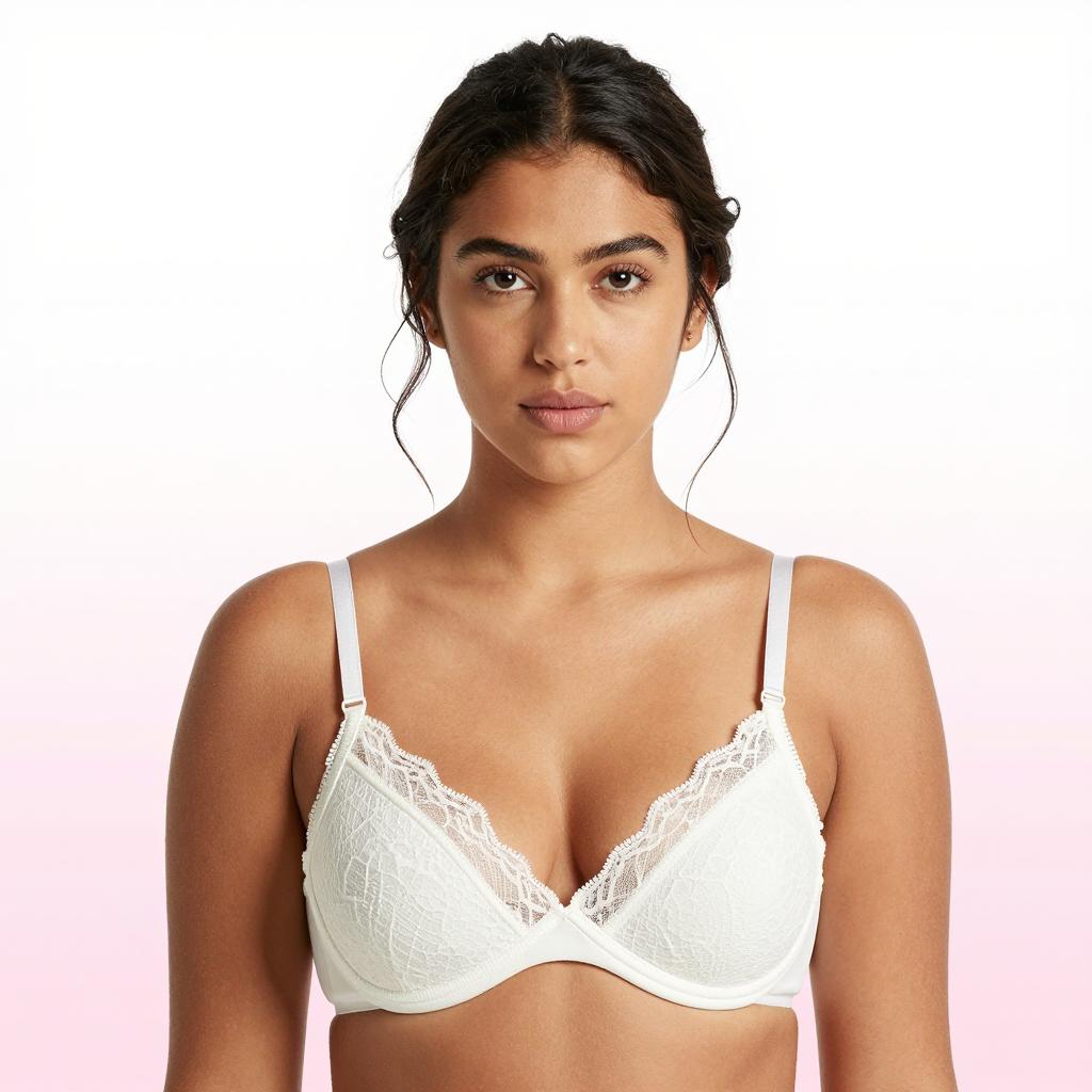 Photograph of a woman with medium brown skin, brown wavy hair, and purple lipstick. She is wearing a white lace bra with underwire and raised her arms above her head. Her yellow nail polish contrasts with the white background. She has a slight smile. Her bra is semi-transparent with lace cups.