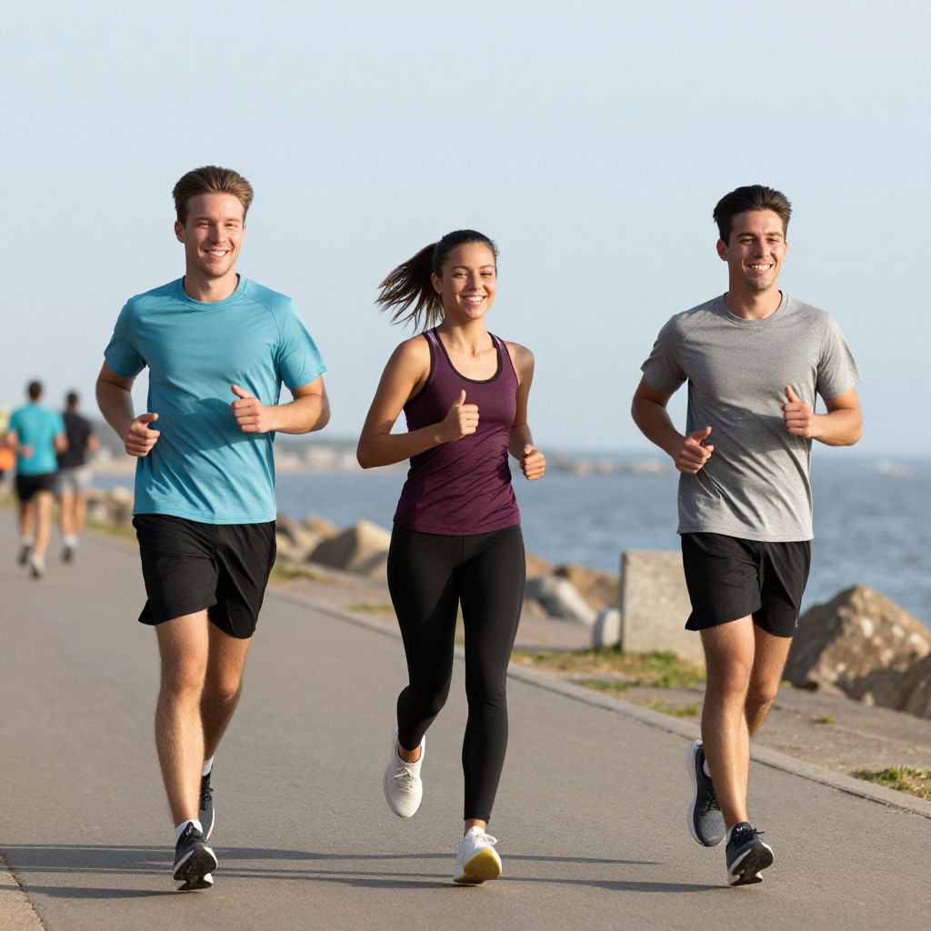 Young runners enthusiastically jogging along a seaside promenade, with three prominently featured individuals—two men and one woman—smiling and giving thumbs-up gestures as they enjoy their workout near the shoreline.