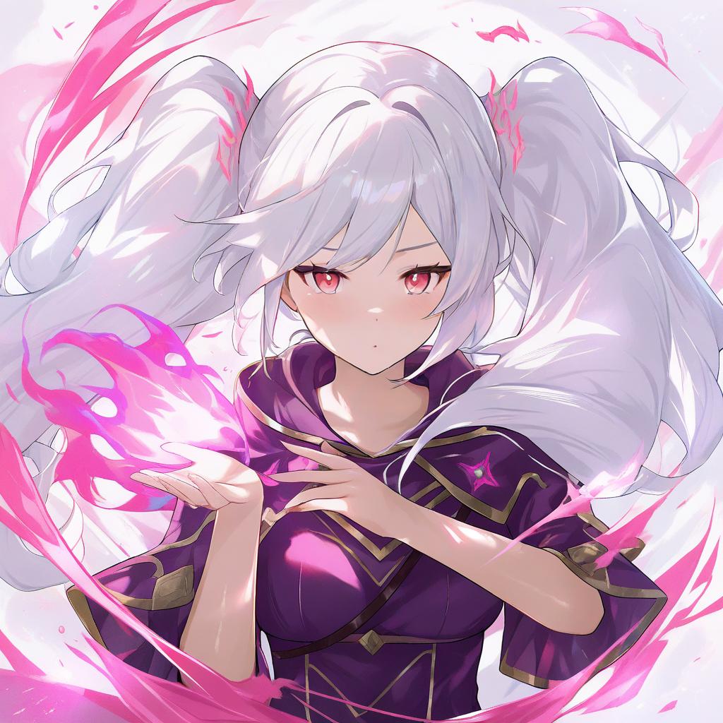 Digital anime-style illustration of a young female character with long white hair styled in twintails, red eyes, and a serious expression. She wears a purple outfit with gold trim and is conjuring pink magical flames in her hands. The image captures dynamic energy with swirling pink flames around her.