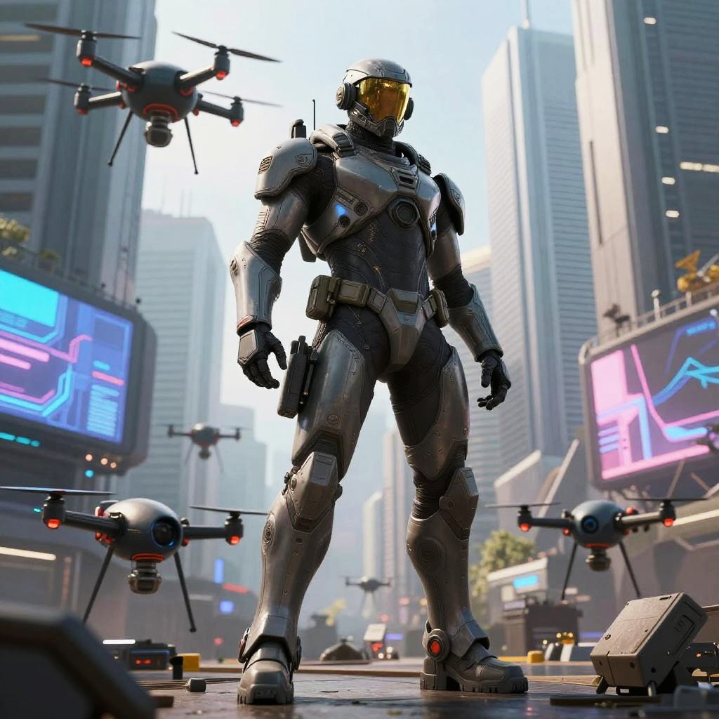 Futuristic guard in a dystopian urban setting, clad in armored combat gear with drone companions hovering nearby, surrounded by towering skyscrapers and digital billboards