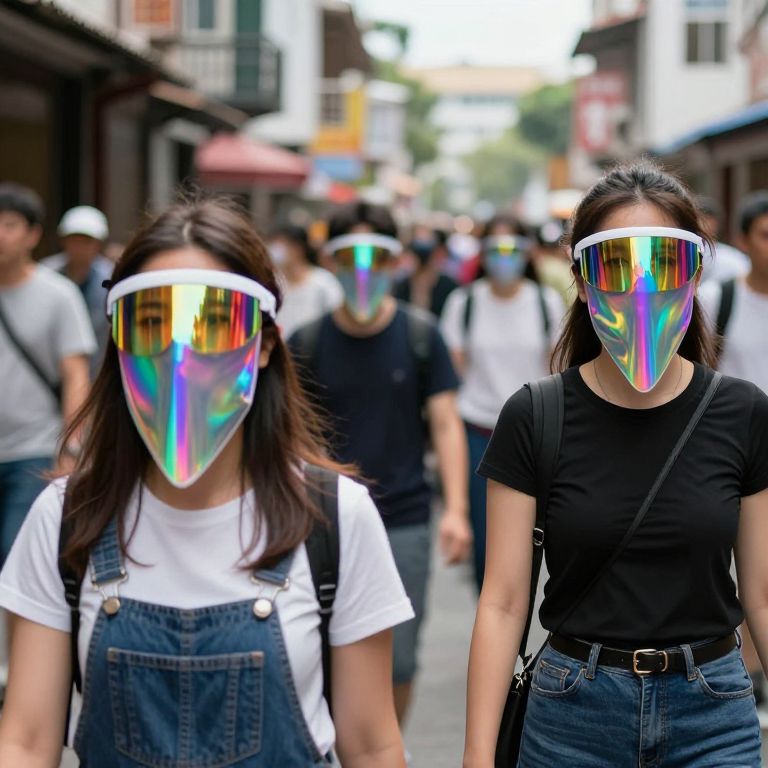 Citizens navigate a bustling street, their faces veiled by iridescent visors that shimmer with rainbow hues, defying the ordinary boundaries between reality and emotion.