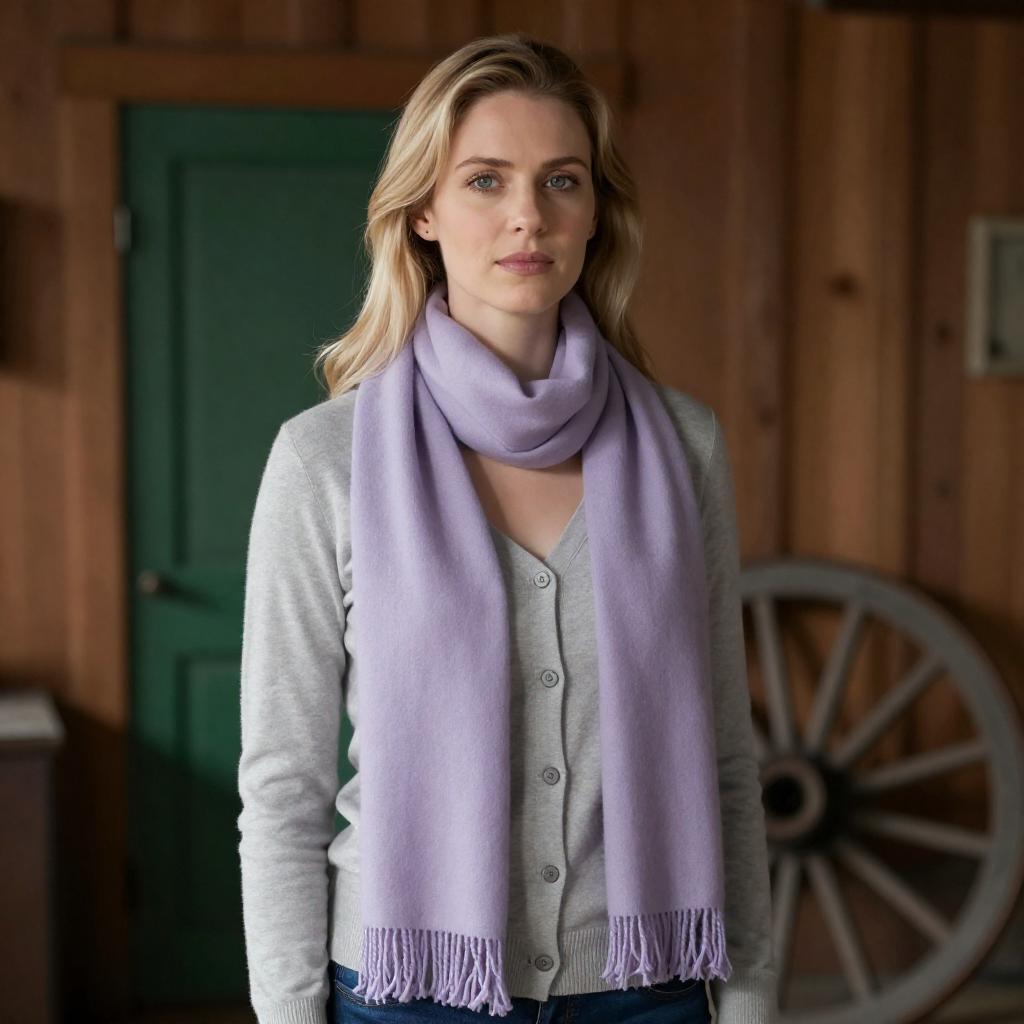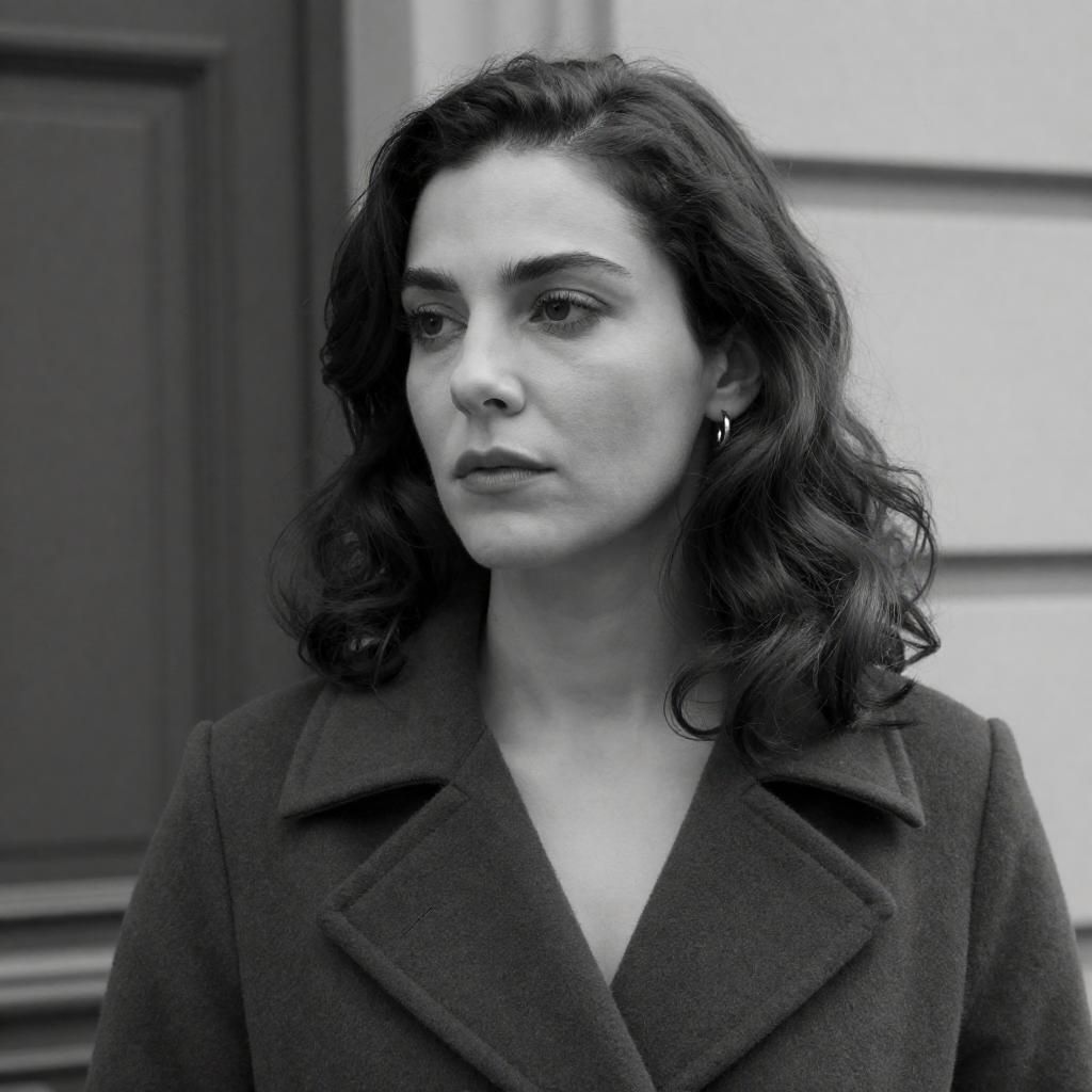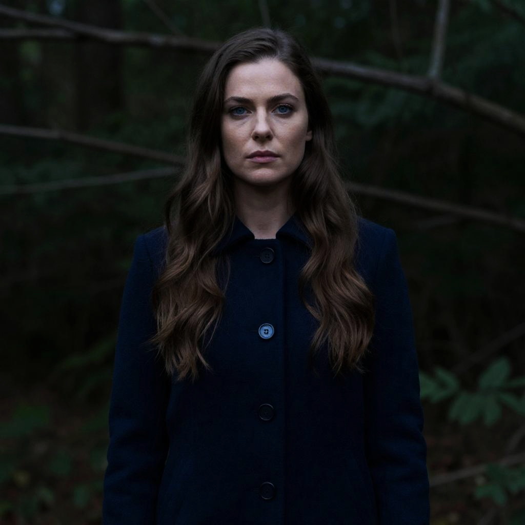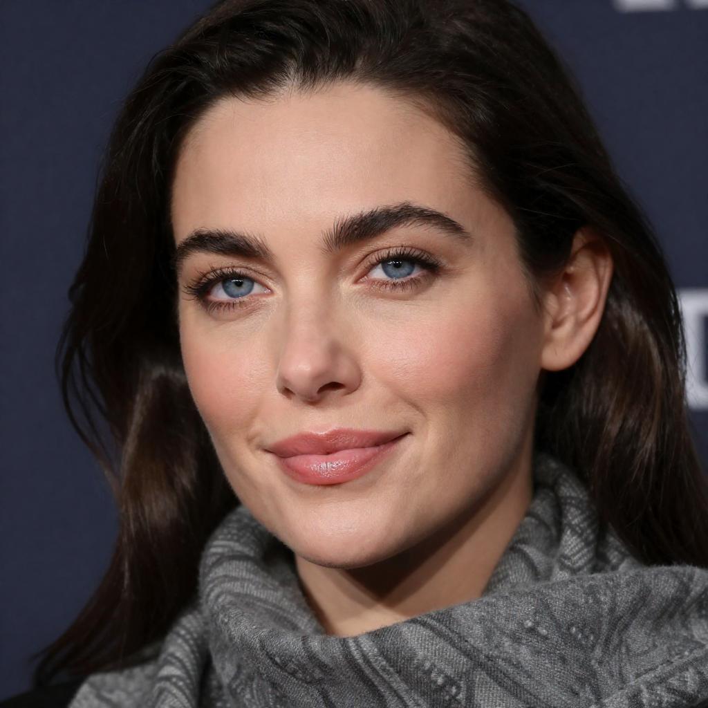 Photograph of a woman with medium-length dark brown hair, light skin, and blue eyes. She wears a gray scarf over a teal top. She gazes to the right with a neutral expression. Dark background. Upper body visible.