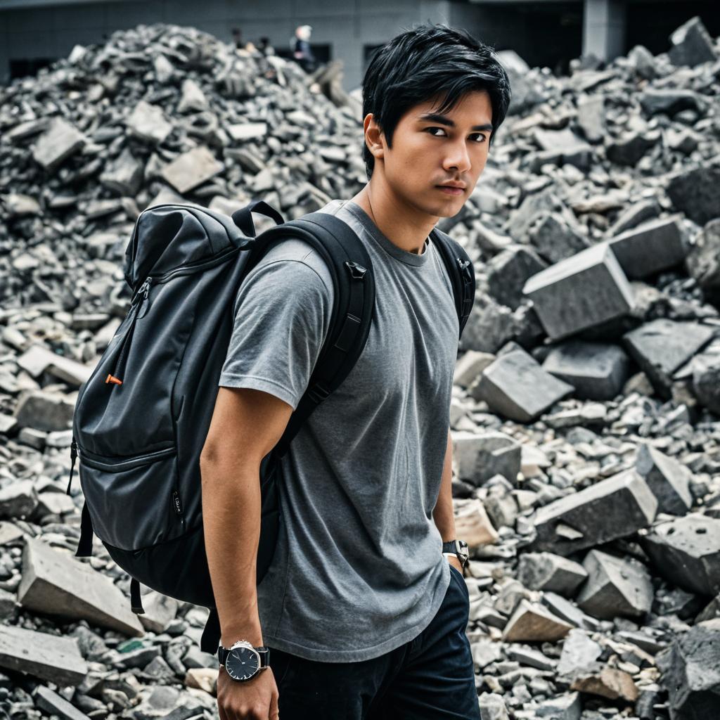 Portrait of a young Asian man with short black hair, wearing a grey t-shirt and black wristwatch, carrying a large black backpack, standing amidst rubble and broken concrete blocks, looking directly at the camera with a serious expression.