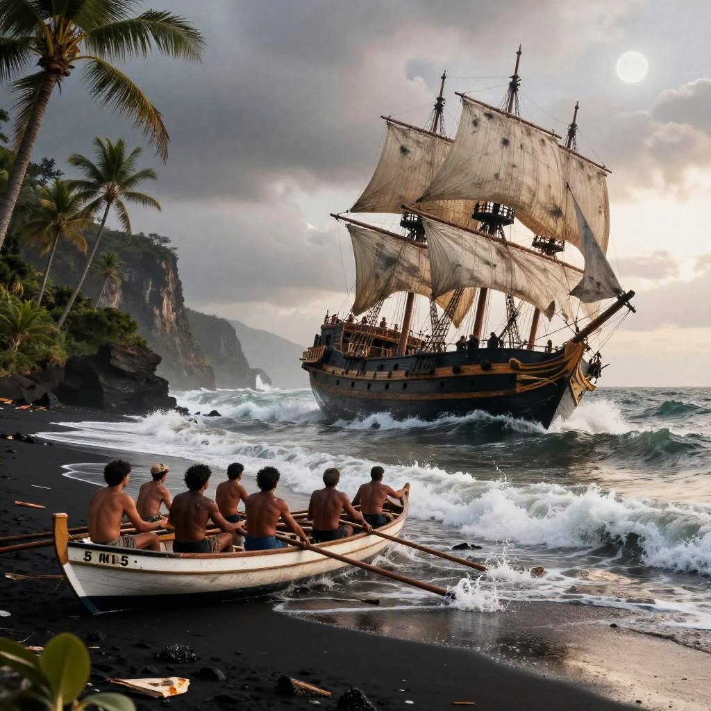 Ultra realistic image of a group of shirtless Spanish explorers rowing a small wooden boat towards a stranded and broken historic sailing ship resembling the Santa Maria from Christopher Columbus' Armada. The scene is set on a black sand beach with large waves crashing and debris floating, surrounded by lush tropical vegetation and coconut palms. Dramatic lighting with pale sunrise and cinematic moonlight highlights the intense atmosphere near rugged cliffs. The image evokes a historic maritime exploration moment with rich detail and cinematic quality.