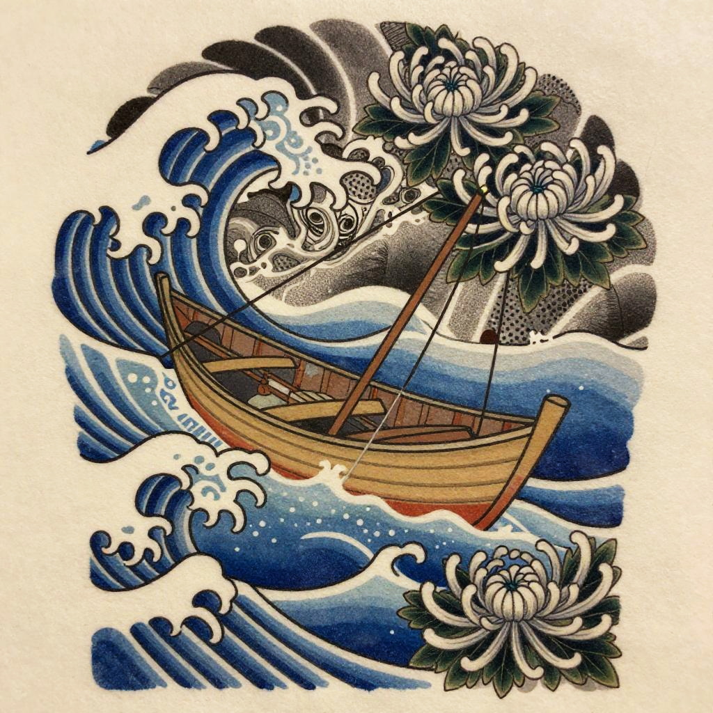 Japanese boat tattoo art portraying a serene fishing boat drifting among majestic waves and swirling wind bars, enhanced with classic chrysanthemums and intricate dotwork, colored primarily in deep blues and blacks.