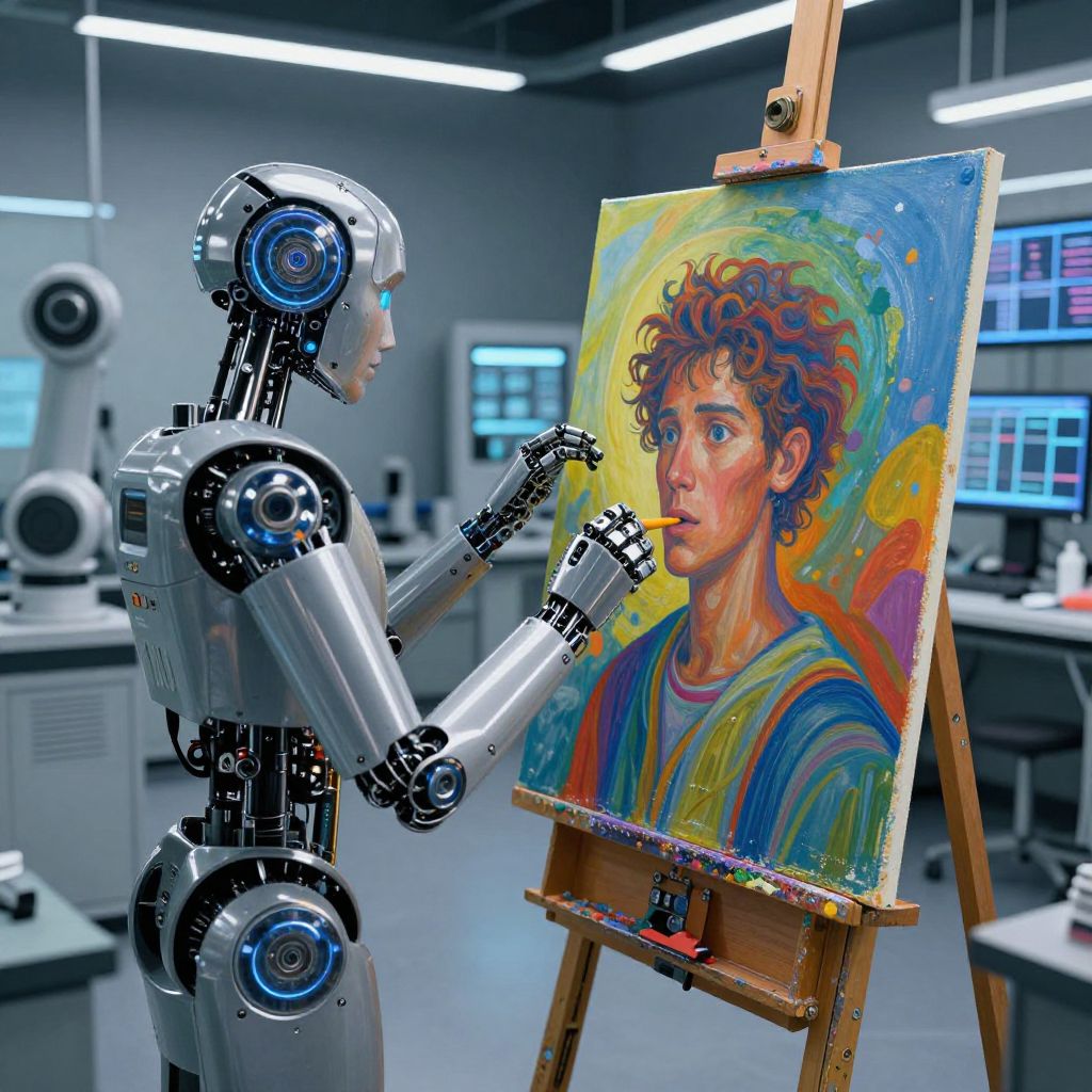 Dall-e imagination manifesting as a robotic painter with multi-appendage arms producing vivid, expressive canvases blending human emotion and machine precision, located in a high-tech lab filled with robotic tools and digital screens, detailed realism