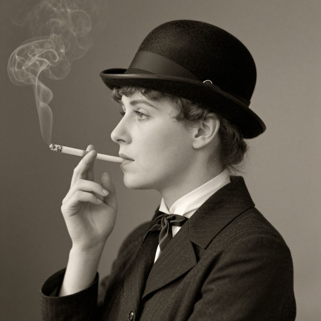 Girl with Cigarette, c. 1925 by Agnes Goodsir: A profile portrait of a woman wearing a black bowler hat and formal attire, smoking a cigarette with a trail of smoke rising to her left, captured in a vintage, sepia-toned style.