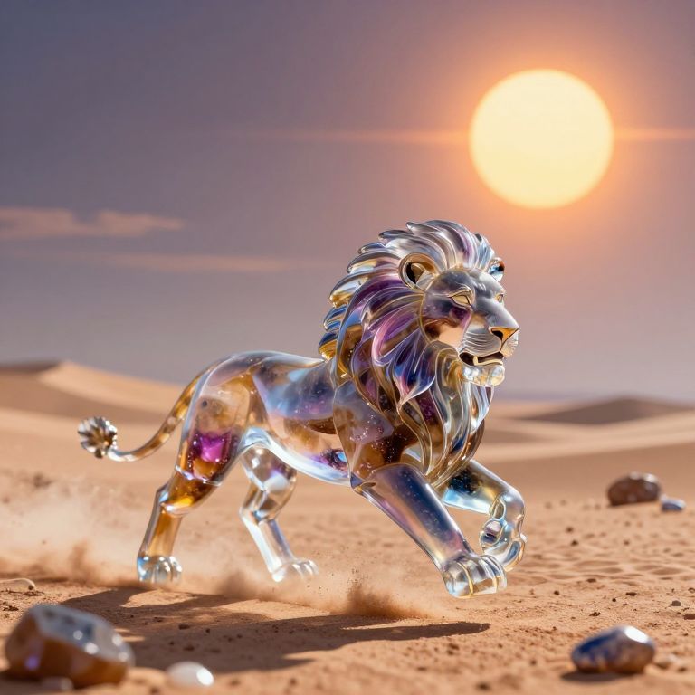Photorealistic CGI image of a transparent, metallic lion with a reflective mane, running through a sandy desert under a bright, glowing sun. The lion's glass-like body captures and reflects the sunlight, creating vibrant purple and blue hues. The background features blurred, sunlit dunes with scattered rocks. The lion's detailed, muscular form contrasts with the smooth, reflective texture of its body, and its fierce expression adds dynamism to the scene. The sun is positioned in the upper right, casting a warm, golden light over the entire image.