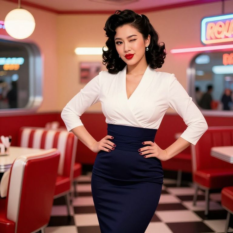 Asian pinup character in a retro diner setting, wearing a fitted kimono-style top with a cinched waist, paired with a pencil skirt, classic pinup curls, playful wink, neon signs and checkered floor in the background, art style reminiscent of mid-century comic art.
