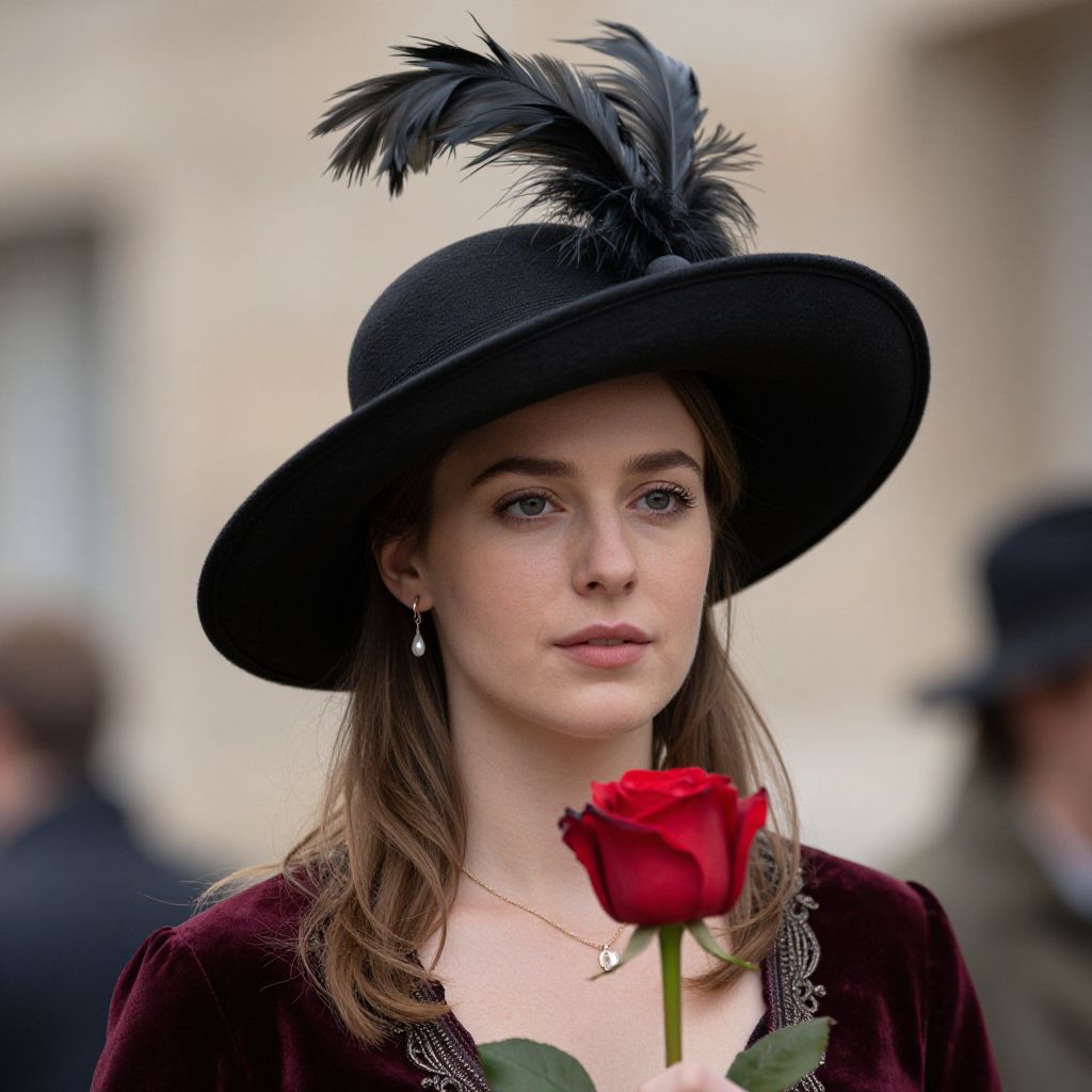 Photograph of a young woman with fair skin and brown hair, wearing a black wide-brimmed hat adorned with a black feather. She has light makeup, small hoop earrings, and a dark burgundy velvet top with a delicate white lace trim. She holds a single red rose in front of her chest. The blurred background suggests an outdoor setting with indistinct people wearing similar dark hats. The overall style is vintage-inspired, evoking a sense of elegance and timeless beauty.