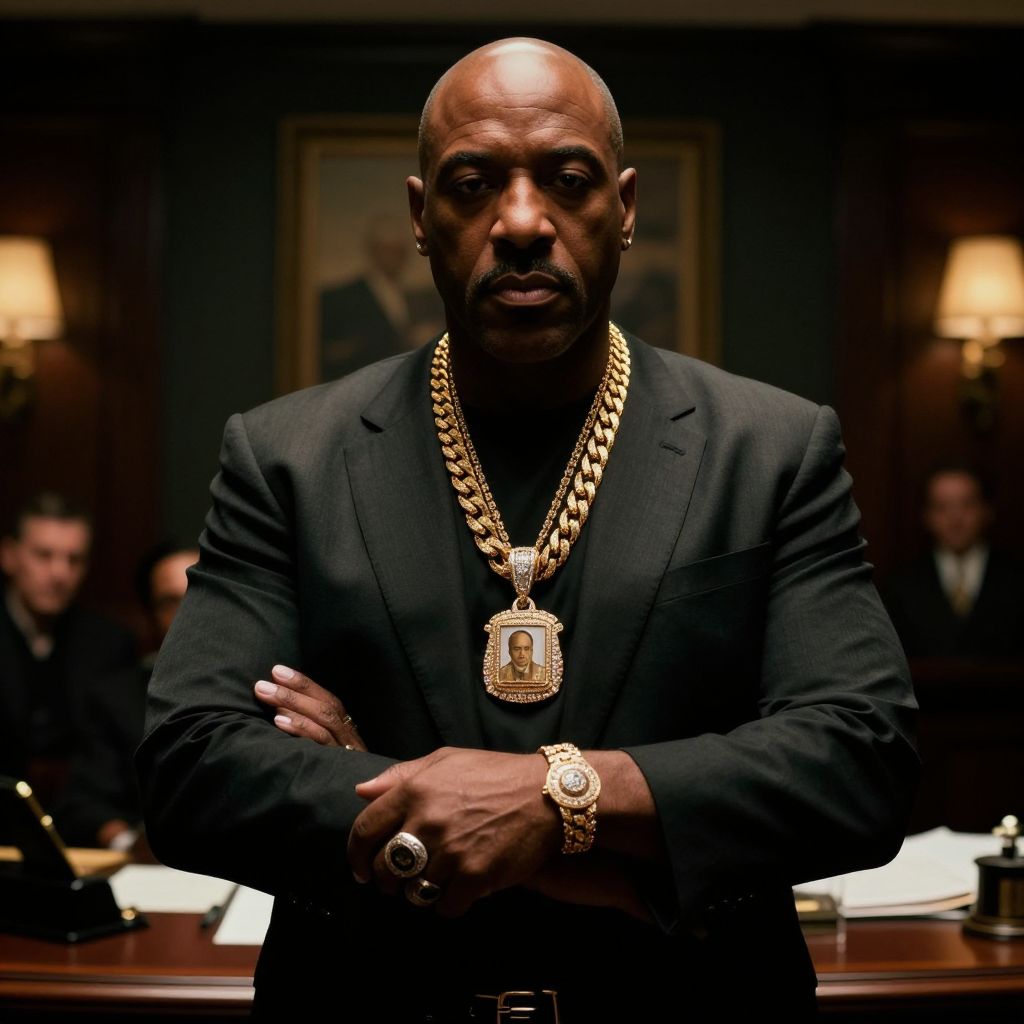 Photograph of a bald, middle-aged Black man with a serious expression, standing with arms crossed in a dimly lit office. He wears a black suit, a large gold chain with a prominent pendant, and a matching gold watch. The background features blurred figures, a dark wood desk, and framed pictures on the wall. The man's skin is dark, and he has a short, neatly trimmed mustache. The lighting highlights his gold jewelry, creating a dramatic effect. The overall tone is formal and authoritative.