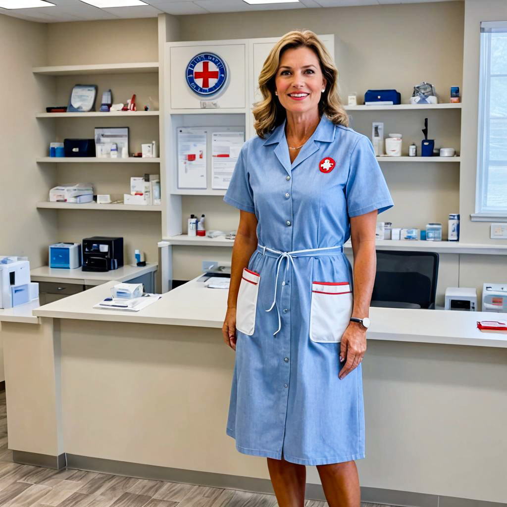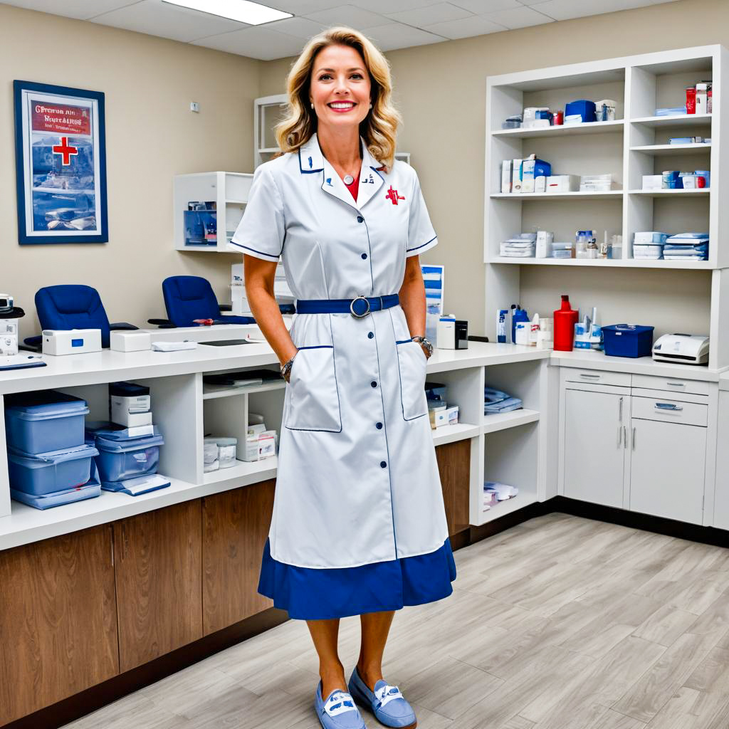 Photo of a Compact Frame woman, Beach Waves, nurse outfit, white dress with Payne’s Gray accents, Chambray fabric, blue apron with Crimson red cross emblem, comfortable loafers, doctor's office, high dynamic range