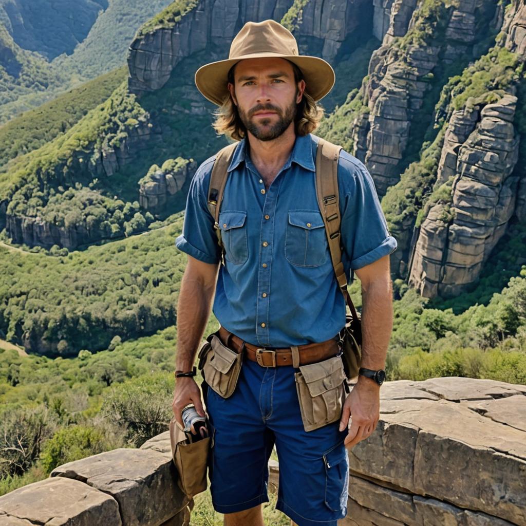 Photo of a Rugged Build man, Natural Locks, safari outfit, khaki short-sleeve in Royal Blue, cargo shorts in Chambray, wide-brim hat, leather wonder armor, utility belt, adventure-ready, Craggy Cliffside, natural supper writing