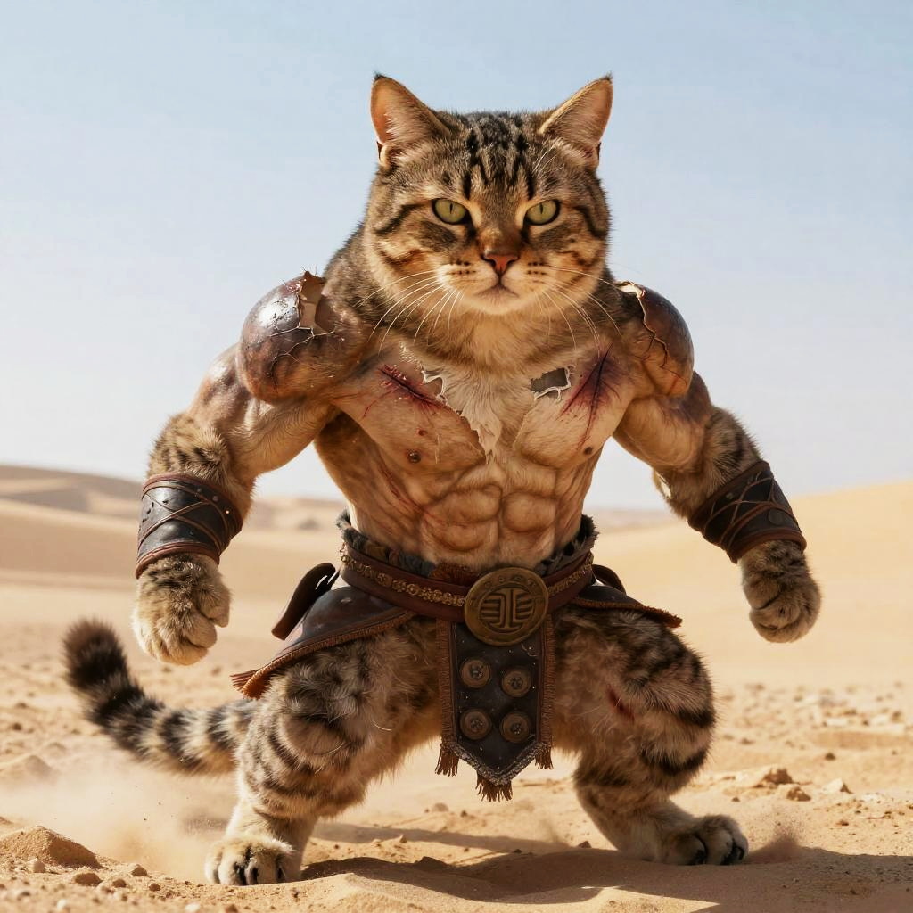 Digitally altered photograph of a muscular tabby cat in warrior attire, with torn armor and a belt, crouching in a desert. Bright sunlight