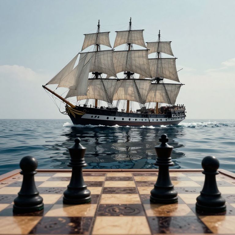 Vast sailing ships with billowing sails glide across the ocean, their silhouettes mirrored by a weathered chessboard foreground where four black pawns stand poised, symbolizing a strategic maritime battle awaiting its silent checkmate.