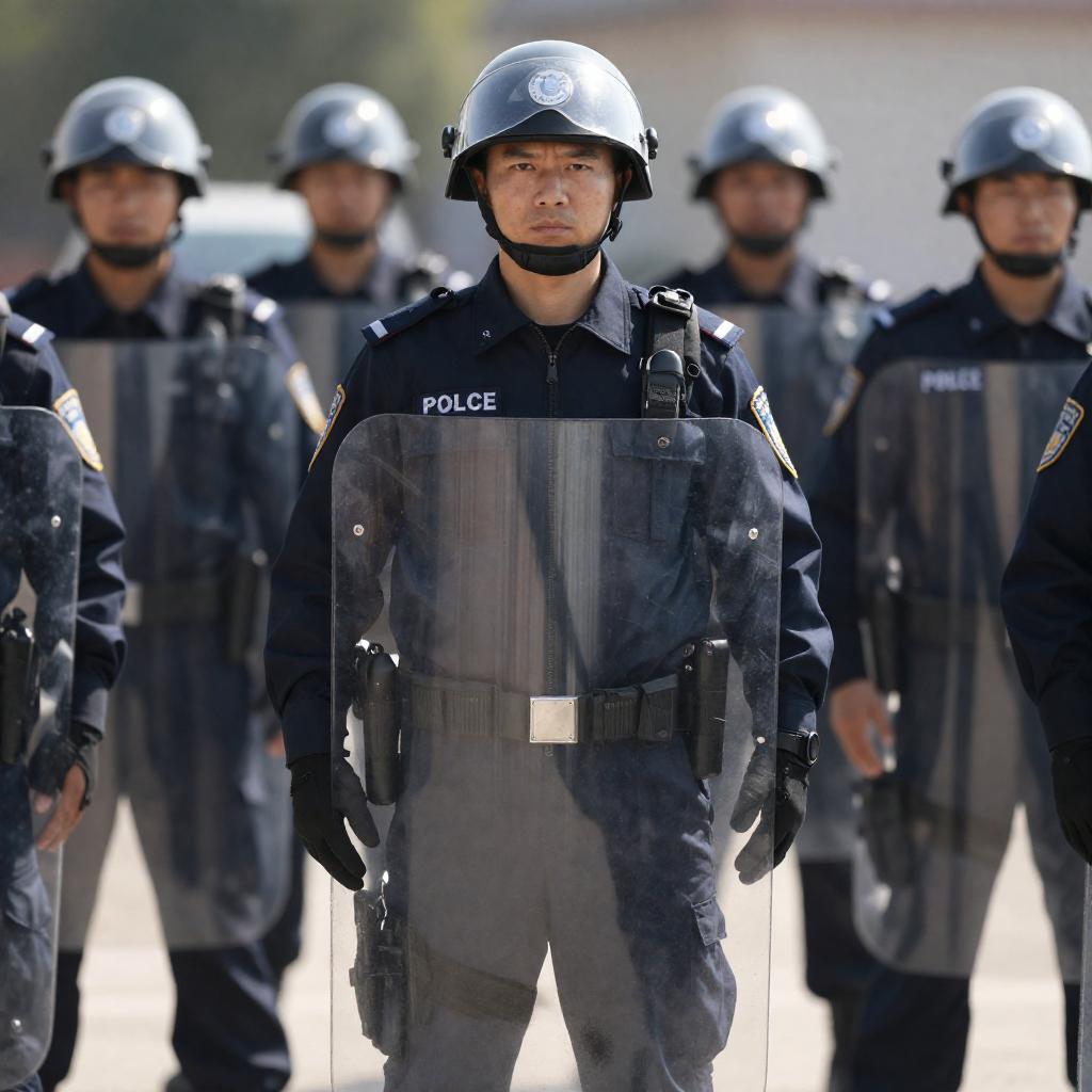 Photograph of a male police officer in black riot gear and helmet, holding a transparent riot shield, standing in front of a group of similarly dressed officers. Background shows more officers, some with helmets turned away. Sunlight casts shadows. Intense facial expression on the central officer. Multiple officers in uniform, clear riot shields, and helmets.