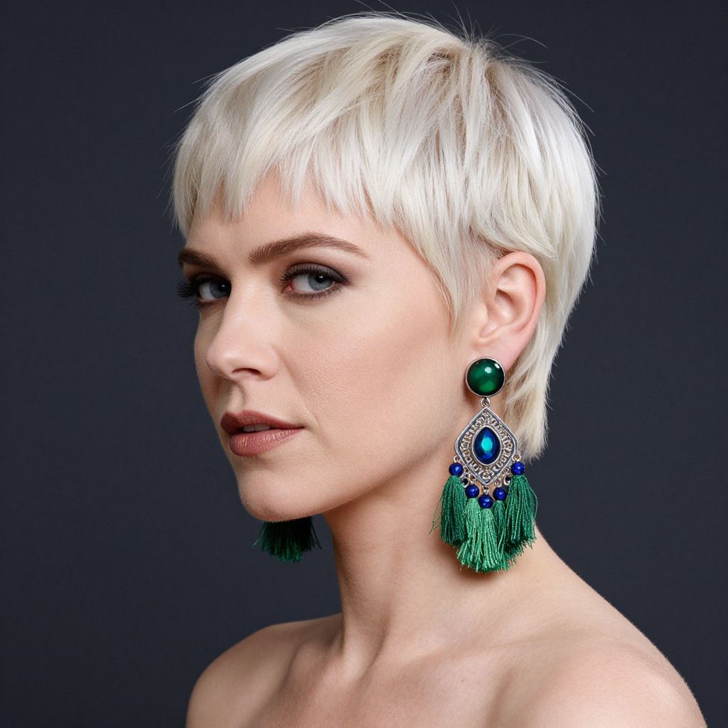 Elegant woman with short, sleek platinum blonde hair styled in a modern pixie cut, accessorized with striking green and blue statement earrings featuring intricate tassel details, exuding confidence and sophistication.