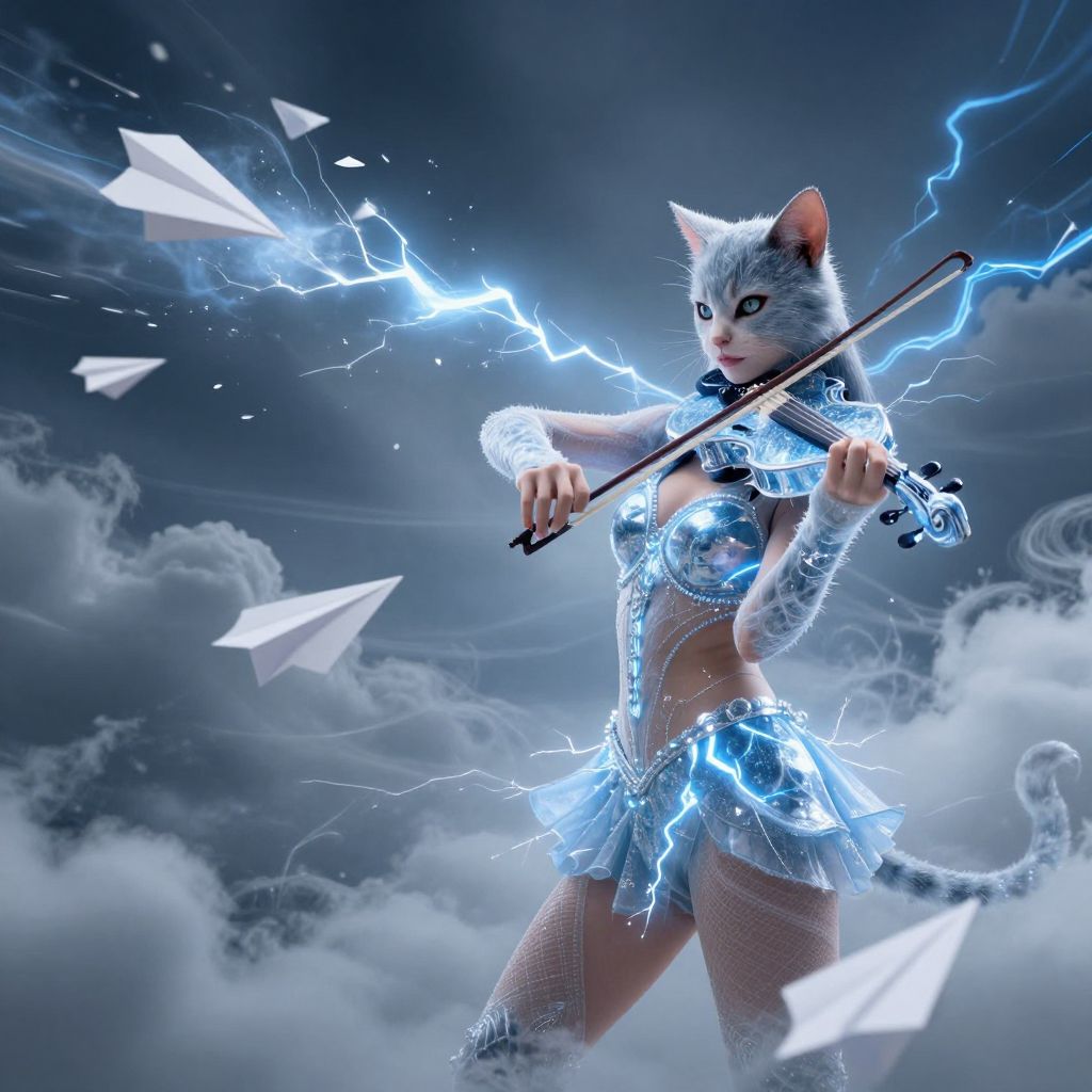 Elegant cat-woman gracefully strums a violin crafted from frozen lightning, conjuring a tempest of white paper airplanes that dance in perfect harmony with her bow's rhythmic strokes against a dramatic backdrop of swirling clouds and electric blue streaks.