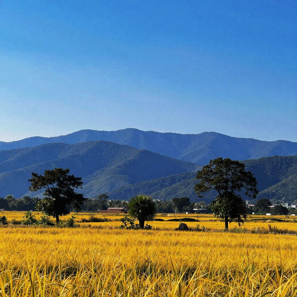 This is a vibrant, digitally altered photograph of a landscape. The foreground has bright yellow grass with scattered dark green trees. The middle ground has a layer of dark blue hills, and the background features distant, shadowy blue mountains under a gradient sky from dark blue at the top to lighter blue near the horizon. The image has a bold, surreal color style.