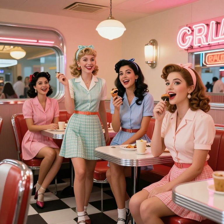 Gorls in a vintage 1950s-style diner, wearing classic retro outfits, pastel colors, chrome and neon signage, cozy interior with checkered floors, lively and nostalgic scene with warm lighting, expressive and cheerful faces.