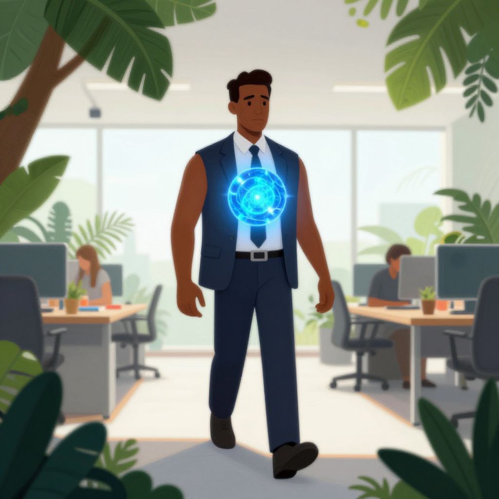 Digital illustration of a muscular man with dark skin and black hair, wearing a blue sleeveless suit, white shirt, and black tie, standing in a brightly lit office. A glowing blue hologram floats over his chest. The background features blurred office desks with two people working, surrounded by large green plants. The office has large windows letting in natural light, creating a modern and professional atmosphere. The man's confident stance and the hologram suggest a futuristic or tech-savvy element.