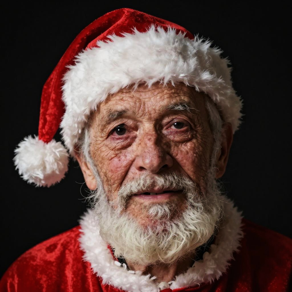 Portrait of very old, (150 years old), poor, homeless, tired, retired Santa Clause, toothless, open mouth, one (eye blind) with ((cataract)), (eye contact:1.3), (intense stare:1.3), on a (plain black background:1.2), (headshot:1.2), (face focus:1.1), (facing the camera:1.2), head in the centre, slight smile but sad, (facing straightforward:1.2), (forward facing:1.1), face, Head, Head focus, Head tilted down, bokeh, f1.4, 40mm, photorealistic, raw, 8k, skin pores, dried-up, textured skin, intricate details, dramatic light, award winning