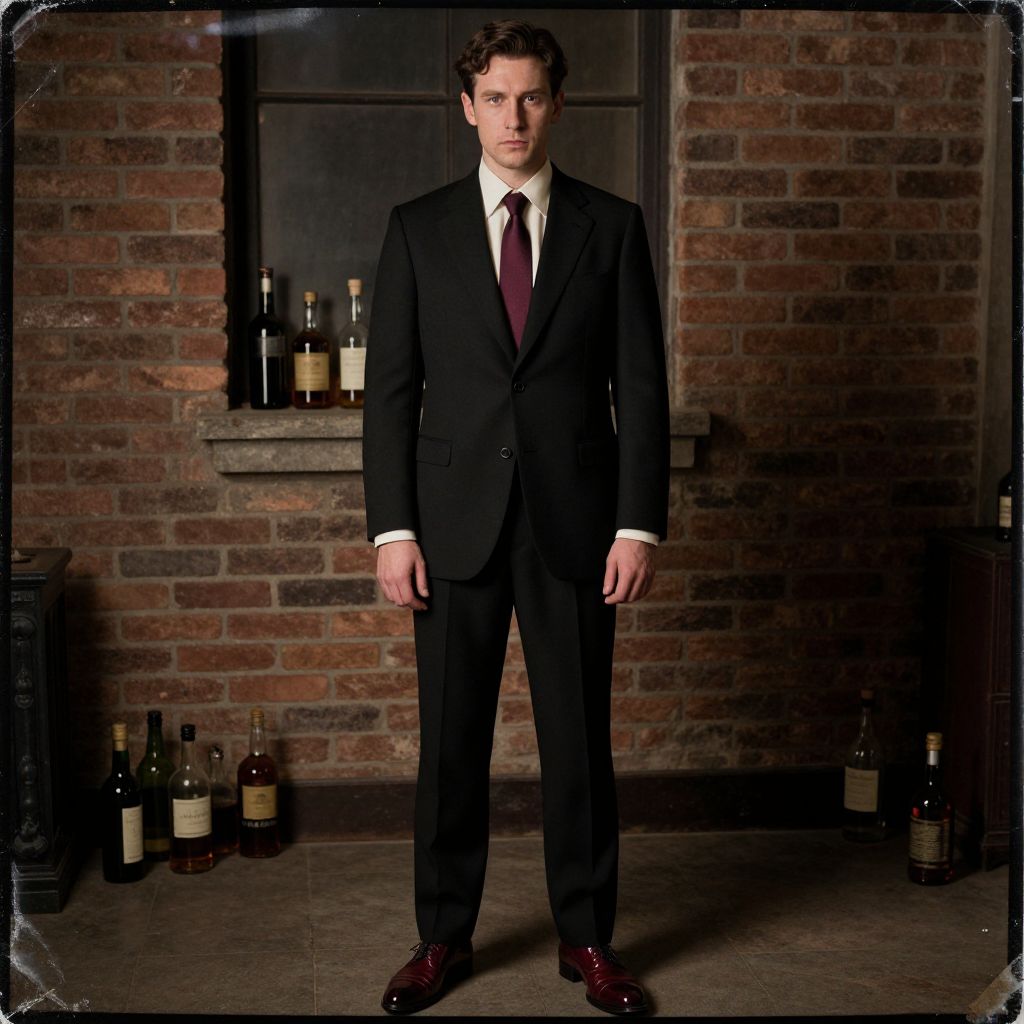 "a man, black two-button suit, ivory dress shirt, deep burgundy tie, patent leather dress shoes, dimly lit, exposed brick walls, vintage whiskey bottles, collodion wet plate style, confident expression Man has masculine face and piercing eyes"