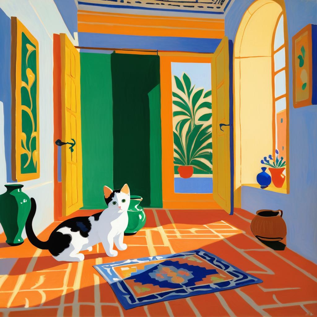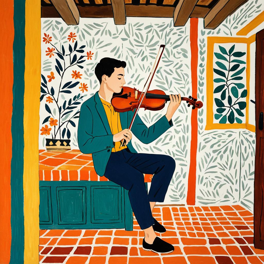 A young man playing a violin, rendered in the style of Henri Matisse, with bold, flat colors and simplified forms. The composition features a rustic interior with stone walls and wooden beams, expressive outlines, and a vibrant color palette of orange, teal, and mustard, evoking a sense of calm and joy.