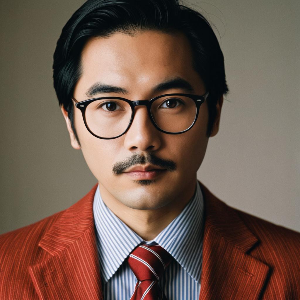 Royal tenenbaums,necktie, glasses, realistic, 1boy, black hair, male focus, mustache, facial hair, looking at viewer, striped necktie, asian, jacket, shirt, solo focus, blurry, red necktie, upper body