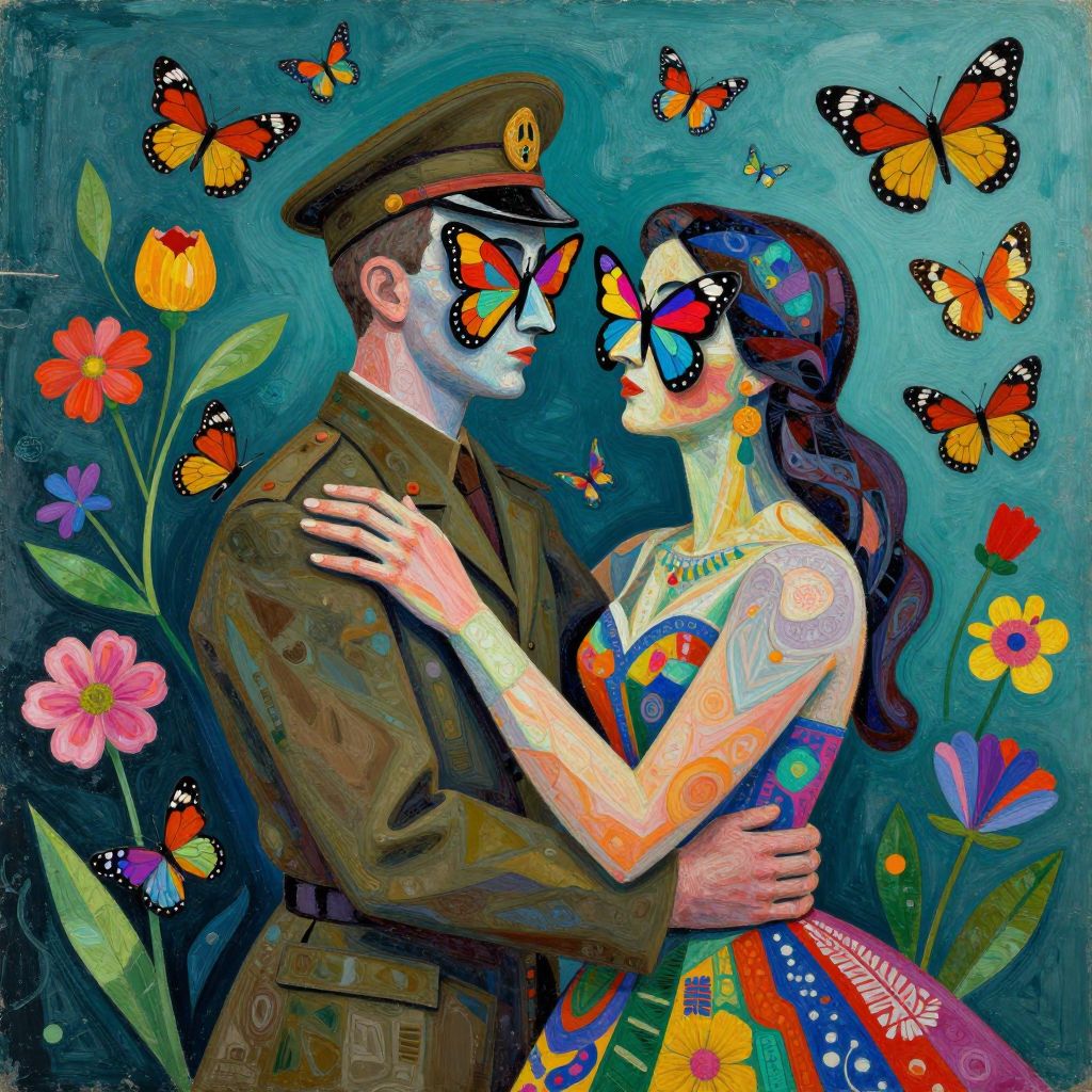 Vibrant digital painting of a soldier in uniform, kissing a tattooed woman in colorful dress, surrounded by butterflies and flowers.