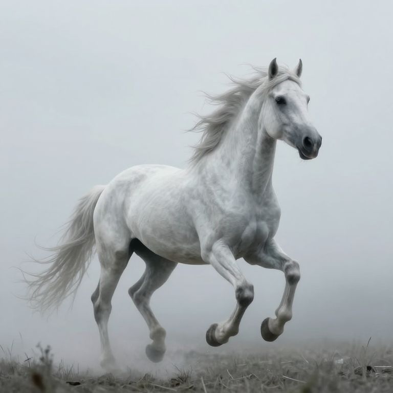 Photograph of a powerful, white, galloping horse with a flowing mane and tail, set against a misty, foggy background.