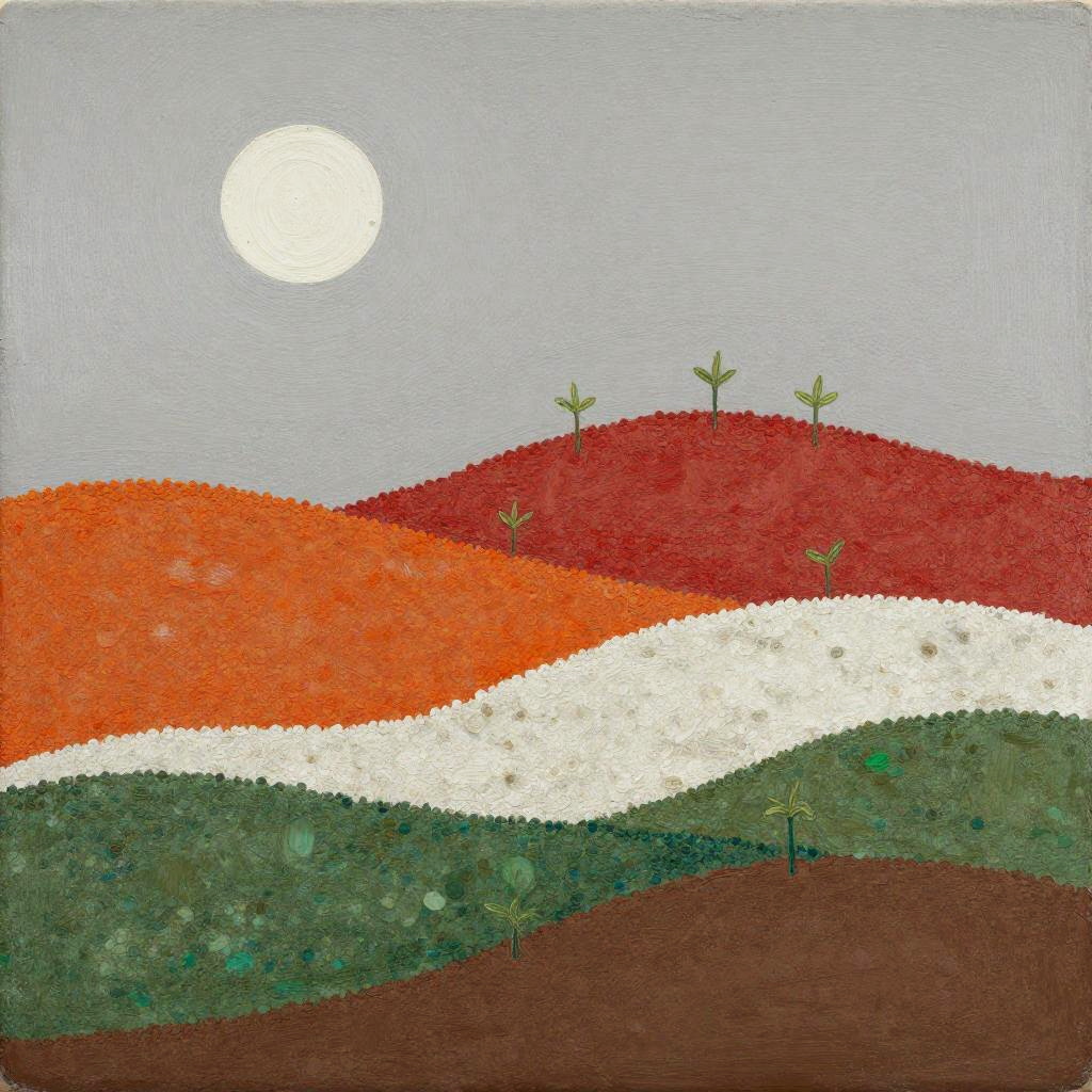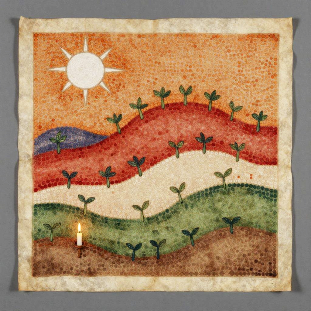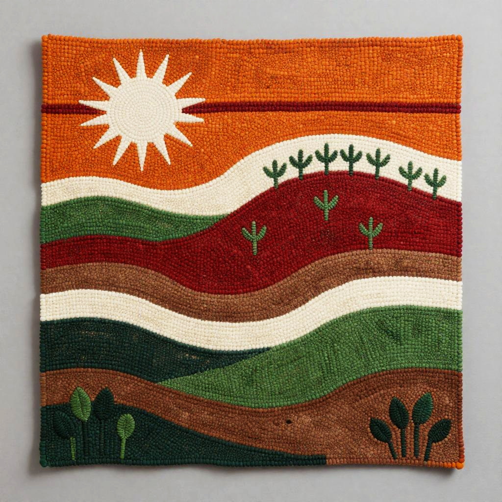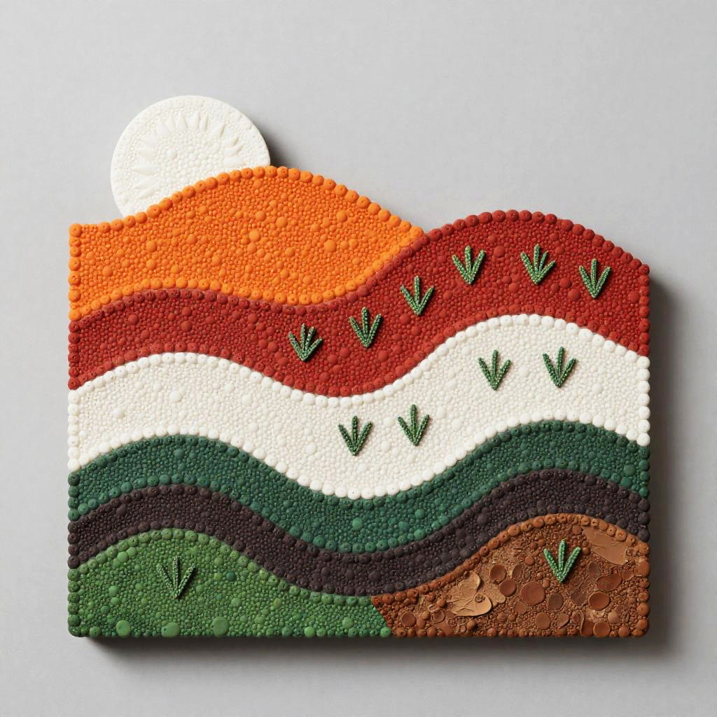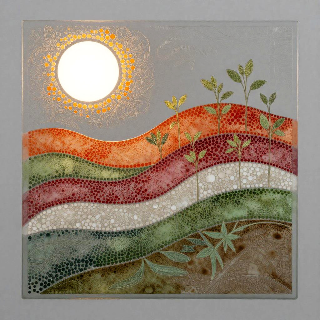 A etched metal panel depicting layered bands of small, round elements in orange, red, white, green, and brown. A white sun-like shape glows at the top-left; the mid-scene rises as a red hill dotted with sprouting green plants; the base blends green and brown for earthy texture; a neutral gray background completes the abstract landscape. minimalist modern, diffused natural lighting. High detail, crisp texture, balanced composition, natural color, subtle depth.