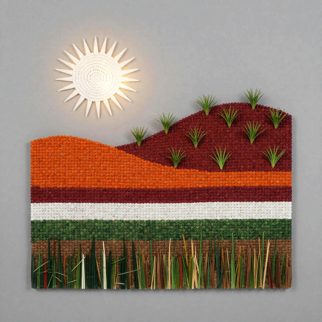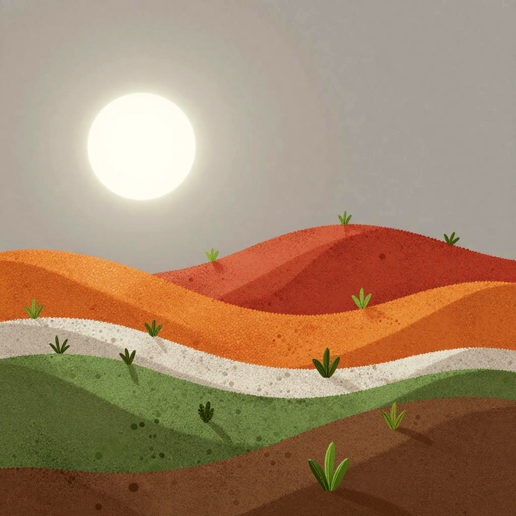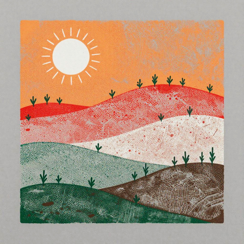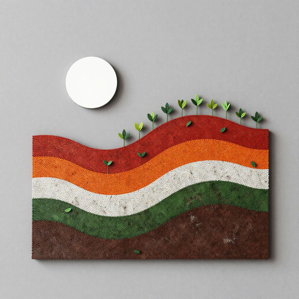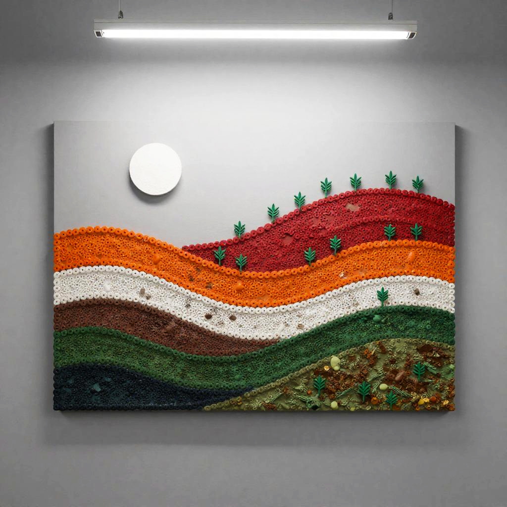 A etched metal panel depicting layered bands of small, round elements in orange, red, white, green, and brown. A white sun-like shape glows at the top-left; the mid-scene rises as a red hill dotted with sprouting green plants; the base blends green and brown for earthy texture; a neutral gray background completes the abstract landscape. minimalist modern, diffused natural lighting. High detail, crisp texture, balanced composition, natural color, subtle depth.