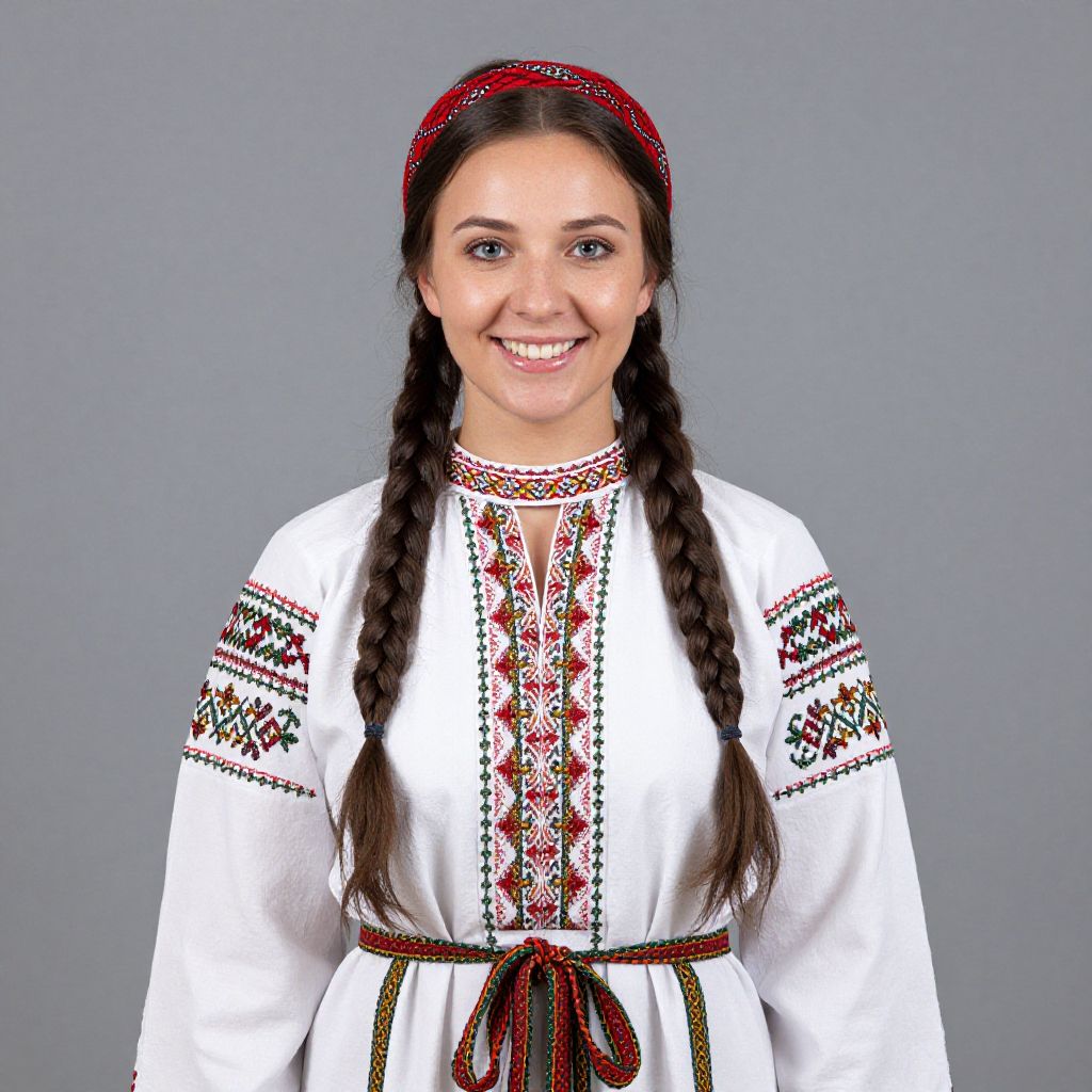 "Traditional Slavic Clothing, woman in a traditional dress with braids and a red headband"