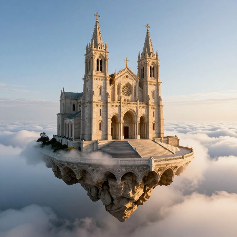 Photorealistic CGI of a Gothic-style cathedral floating on a rocky island amid fluffy clouds under a clear blue sky.