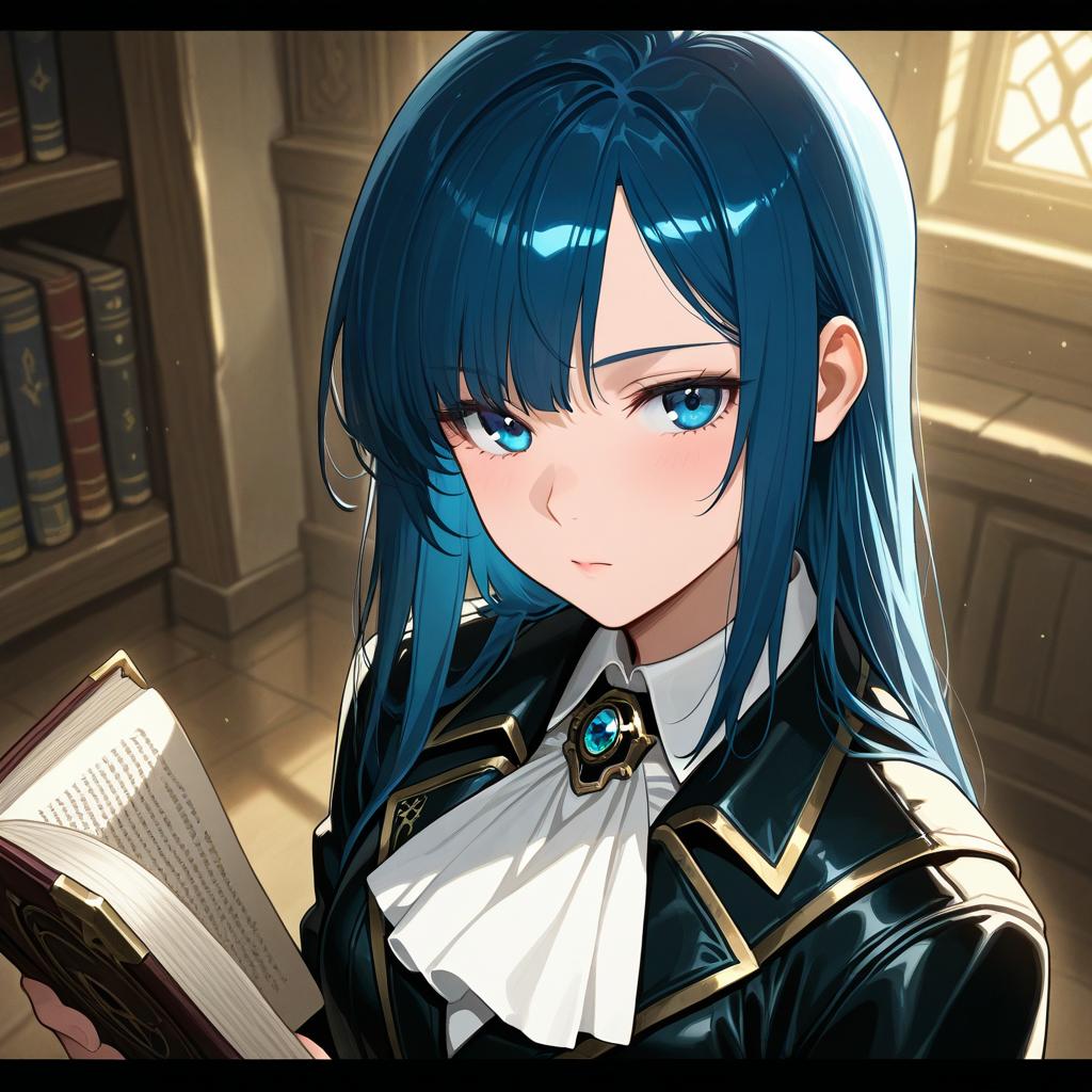Arcane style, 1girl, solo, long hair, bangs, letterboxed, book, closed mouth, blue eyes, ascot, holding, jacket, shiny hair, blue hair, upper body, looking at viewer, holding book, shiny, indoors, white ascot, brooch, asymmetrical bangs