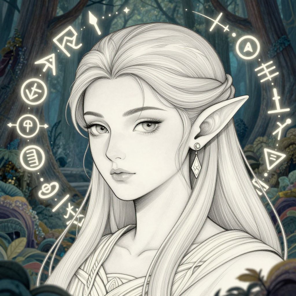 Pointed ears drawing of a mystical elf character, intricate line art with fine details, fantasy style, soft shading, elegant and graceful features, surrounded by glowing magical runes, set in an enchanted forest background.