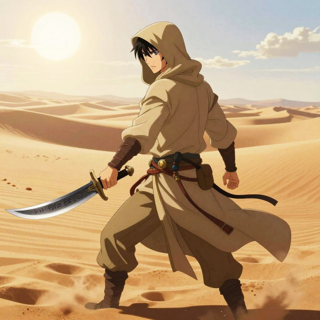 A stealthy desert rogue, wearing light sand-colored robes with a hood, wielding a curved scimitar with ancient runes, in a vast golden desert under a blazing sun, illustrated in the dynamic and mystical anime style of Koyoharu Gotouge.