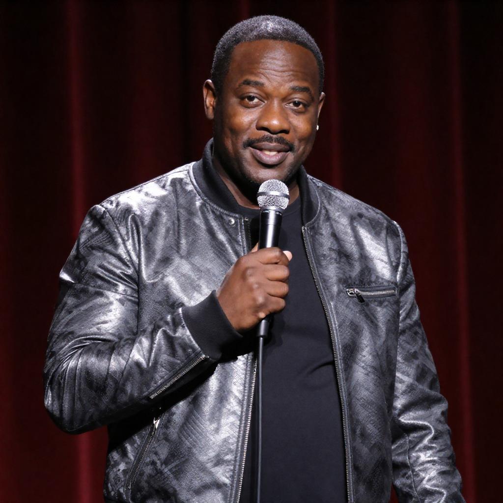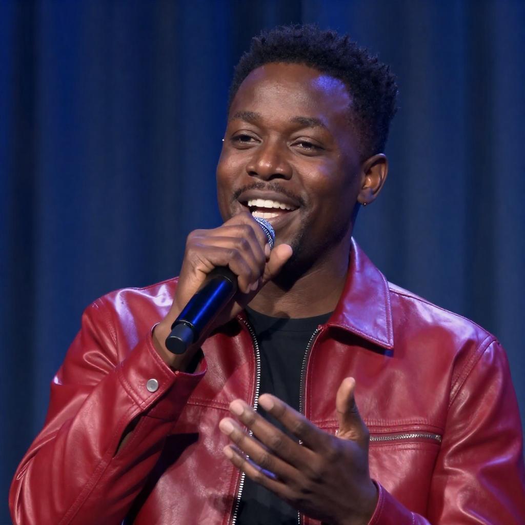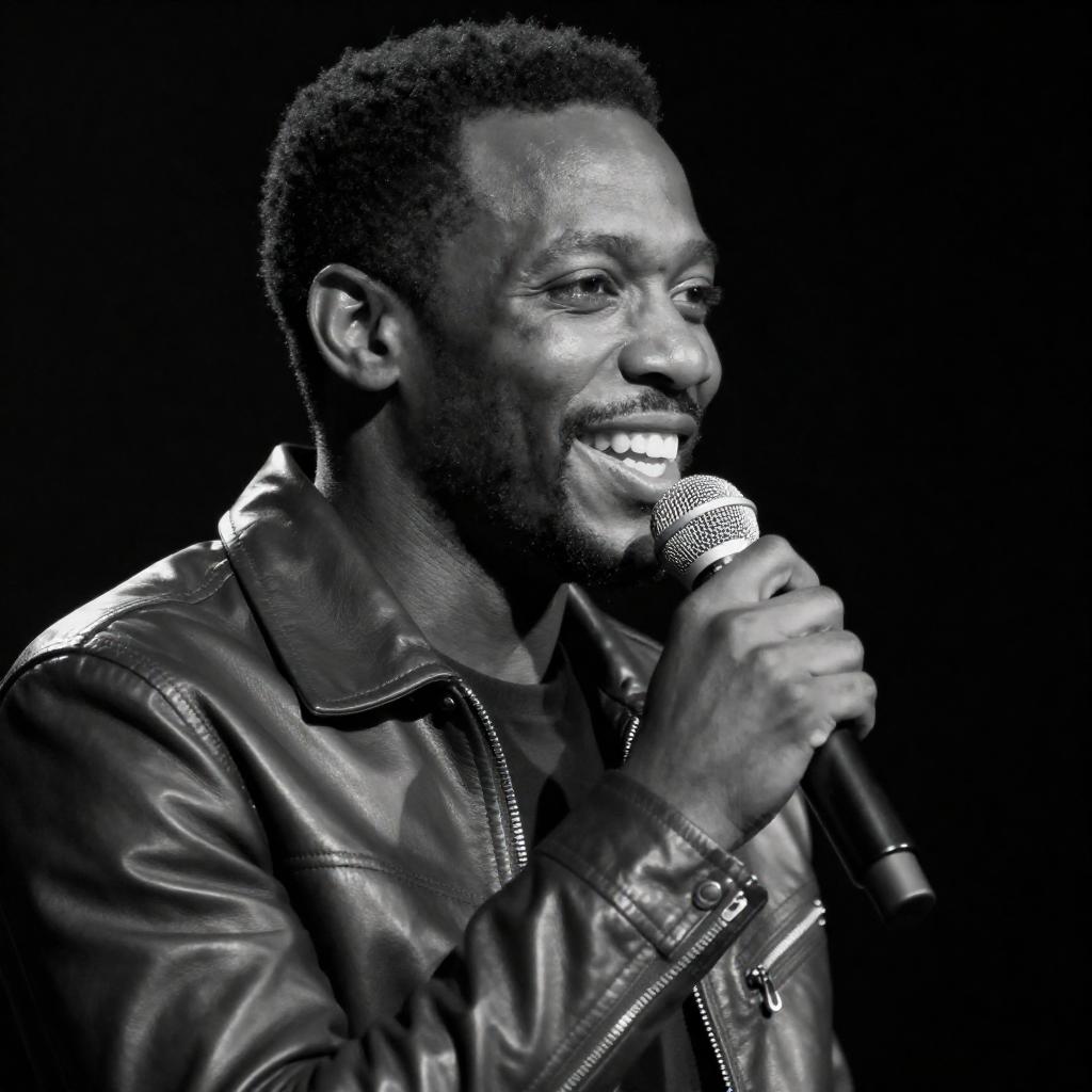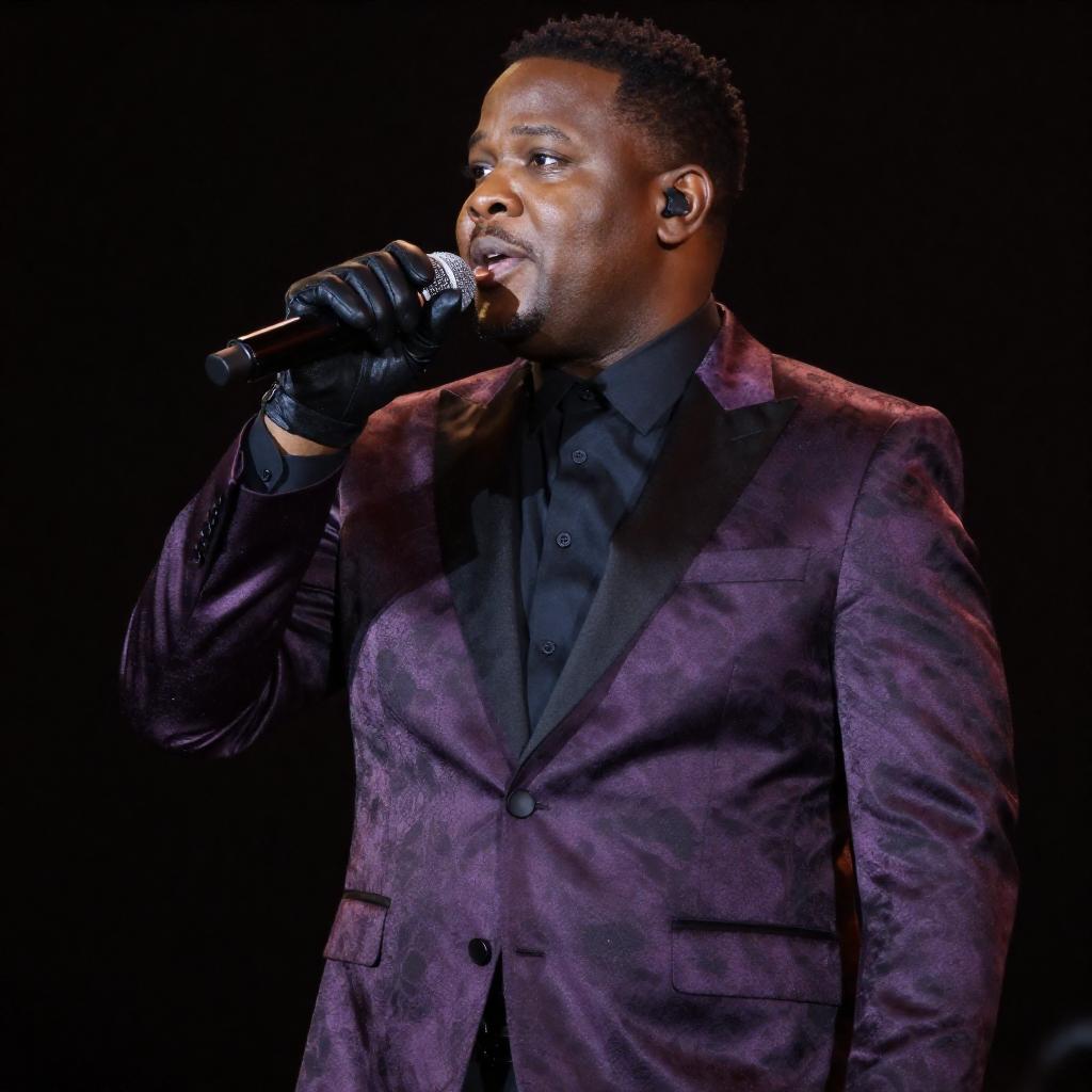 Photograph of a male singer with dark skin and short black hair, wearing a shiny, silver, zip-up jumpsuit and black shirt, standing on a stage with red curtains in the background. He holds a microphone in his right hand and stands with legs apart, looking forward. A small white stand is on the right.
