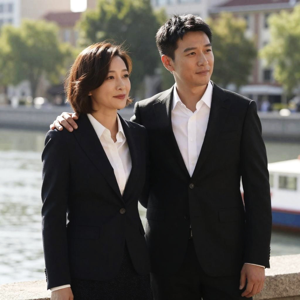 A man and woman in a warm indoor restaurant setting, sharing an embrace. The woman has shoulder-length brown hair and is wearing a light gray sweater, smiling warmly. The man has dark hair, wearing a maroon shirt, with a surprised expression on his face. The table in front of them has glassware and plates, slightly blurred.