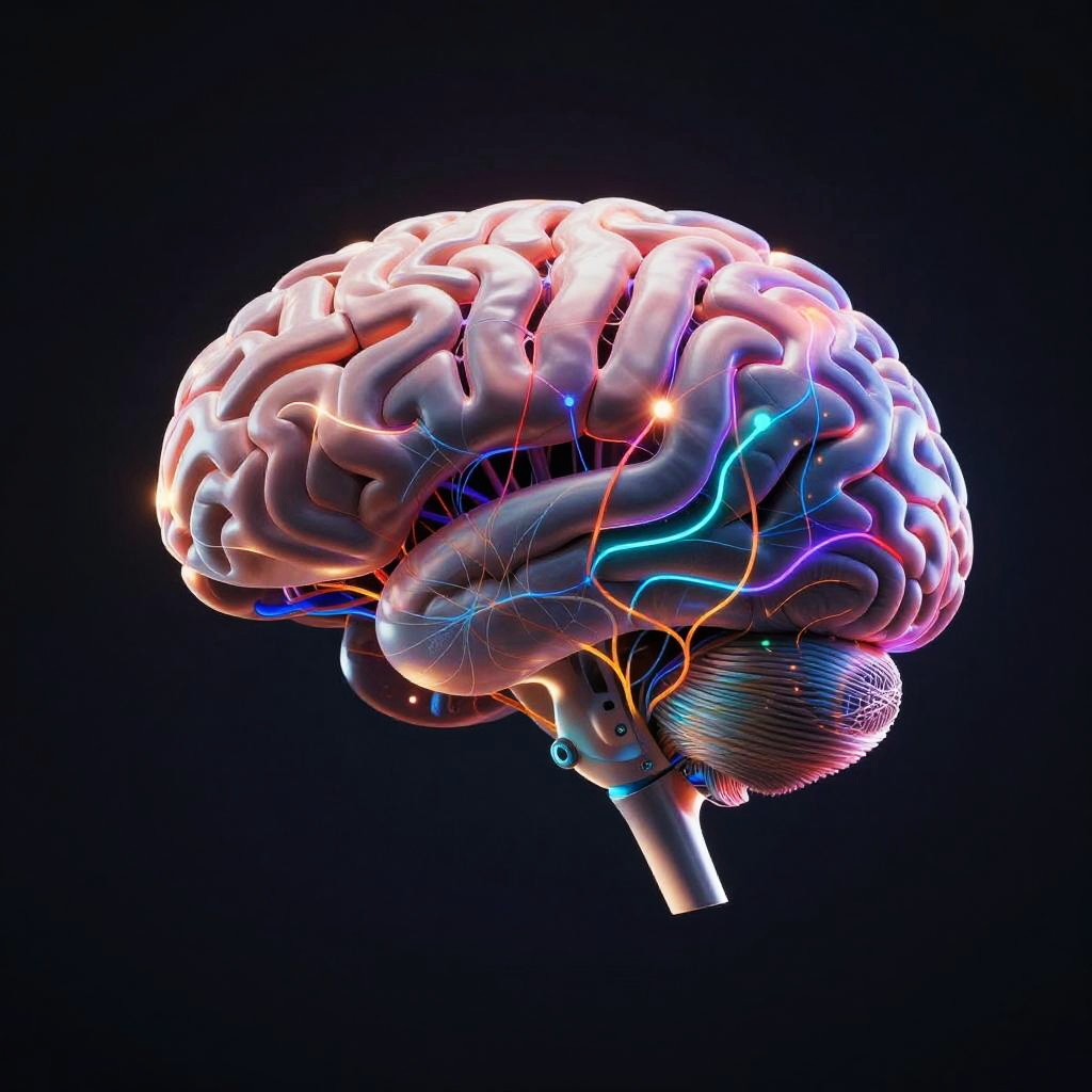 Ai album art depicting a cybernetic brain with colorful neural connections illuminating against a dark background, sleek modern design, high-tech aesthetic with smooth gradients and glowing effects, symbolizing artificial intelligence and music synergy
