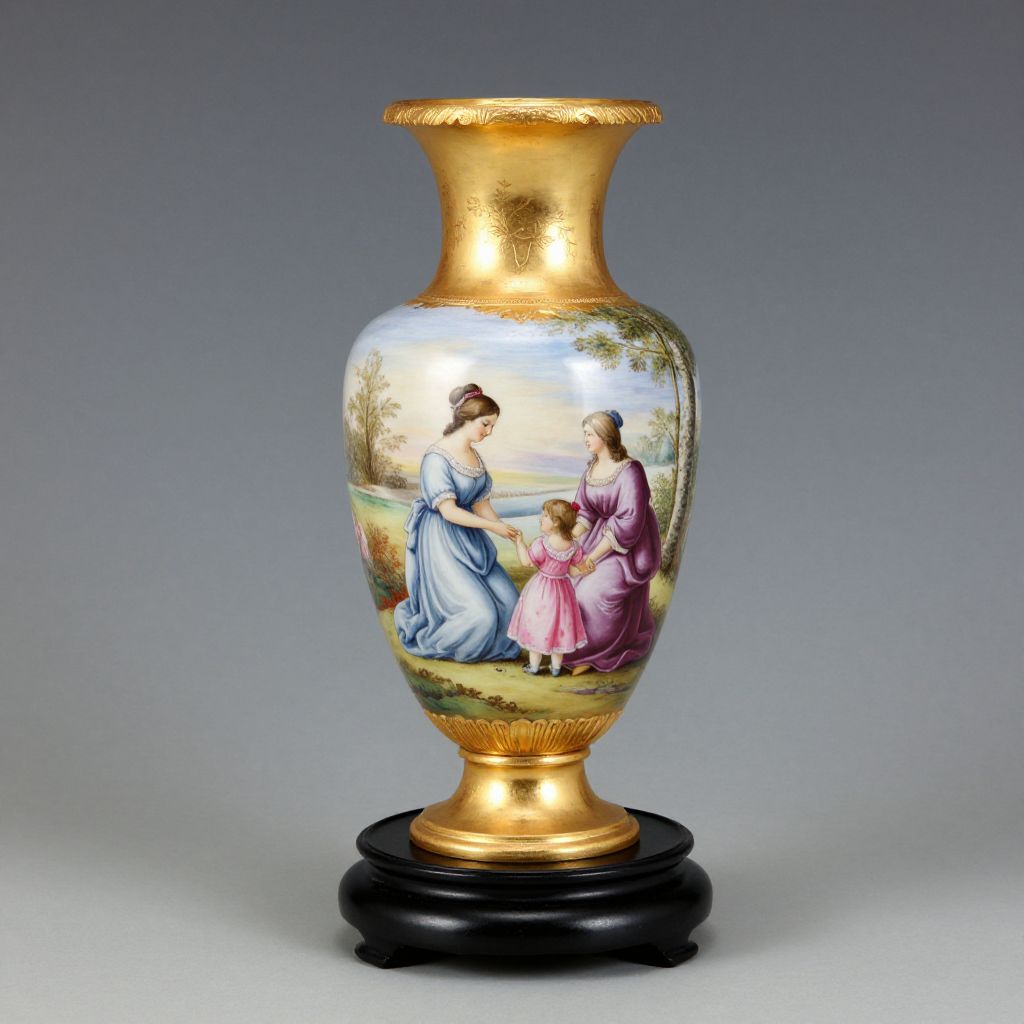 Gilded porcelain vase stands elegantly on a black wooden base, featuring a hand-painted scene of three figures—a woman in blue, another in purple, and a child in pink—engaged in a tender interaction against a serene landscape backdrop, characteristic of 19th-century Continental craftsmanship.