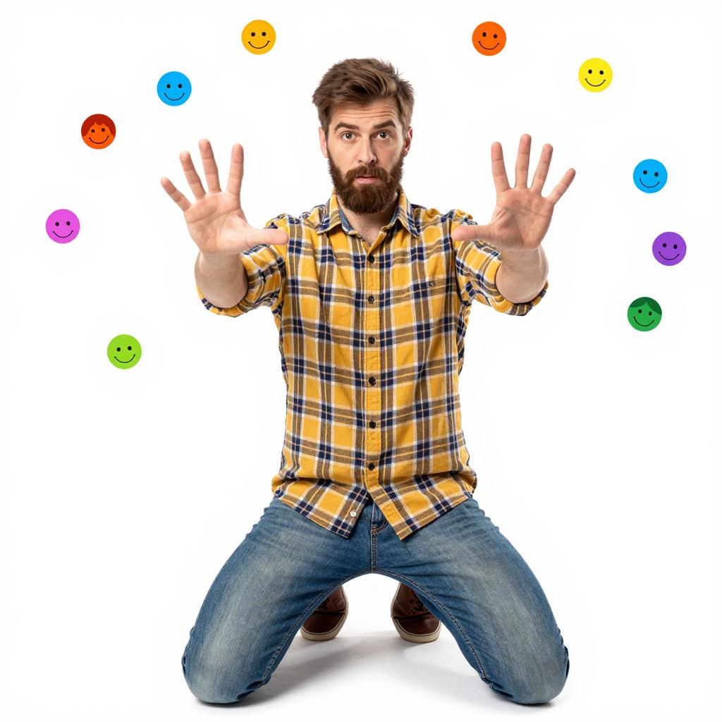 Man with brown hair and beard, wearing a yellow plaid shirt, blue jeans, and brown shoes, kneels with legs apart. Both hands extended forward, fingers spread wide. Background is a of small, colorful faces. White background.