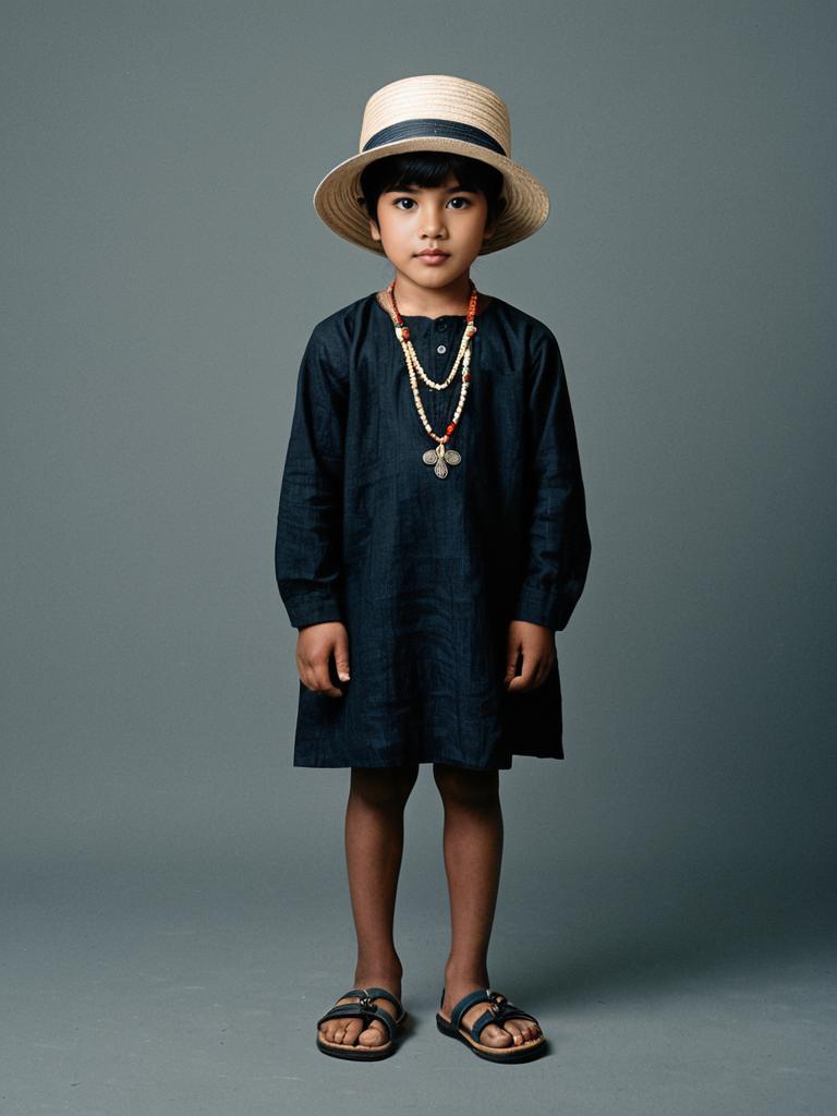 Child gopalkala dress, 1boy, solo, male focus, hat, looking at viewer, black hair, sandals, standing, child, long sleeves, closed mouth, simple background, black eyes, necklace, grey background