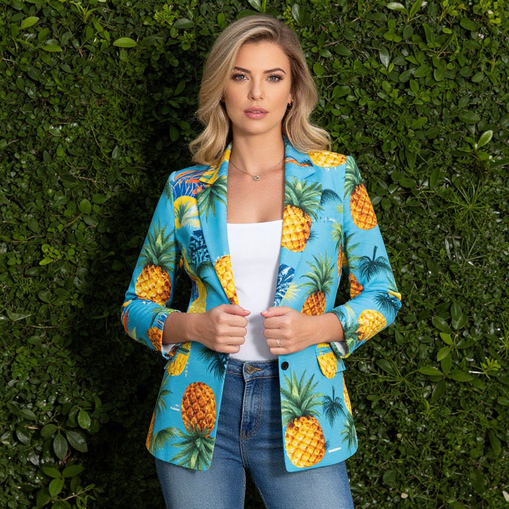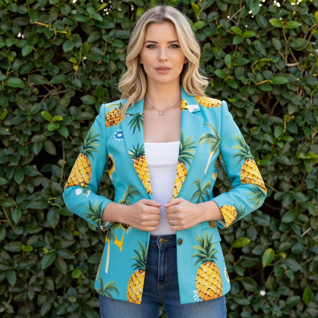 Blonde woman wearing a vibrant tropical blazer featuring pineapple and palm tree patterns, paired with a white top and jeans, stands confidently against a lush green hedge while adjusting her jacket buttons.