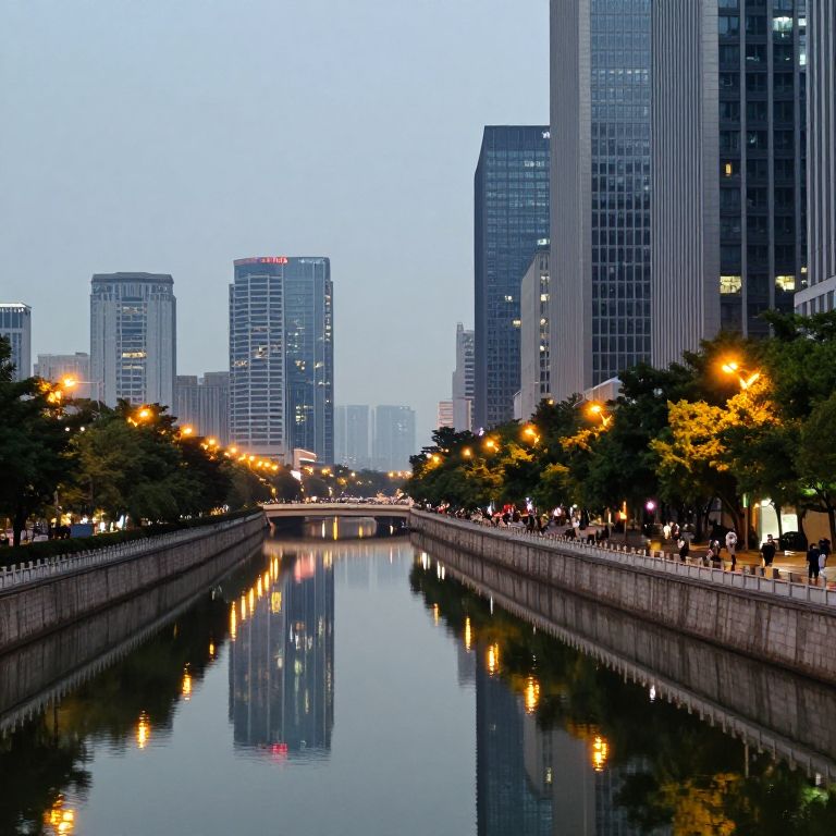 Photograph of a cityscape at dusk featuring a calm, reflective canal in the foreground, flanked by concrete walkways lined with trees and glowing streetlights. Tall, modern skyscrapers with glass facades rise on both sides, their lights beginning to illuminate the sky. The background shows a hazy, blue-gray sky with more buildings fading into the distance. The canal's mirrored surface captures the warm, yellow streetlights and the silhouettes of the buildings, creating a symmetrical, tranquil scene. The overall mood is serene and urban, with a mix of natural and architectural elements.