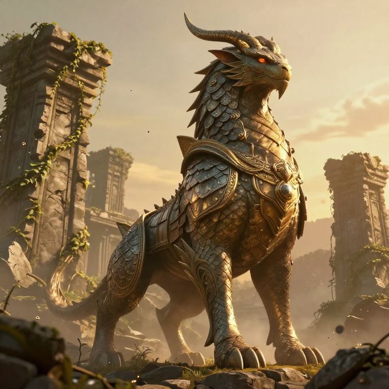 Hoxxes depicted as a mythical beast guarding ancient ruins in a fantasy landscape, crumbling stone structures overgrown with vines, warm golden hour lighting, majestic and imposing stance, richly detailed scales and armor plates, atmospheric depth with mist and floating particles.