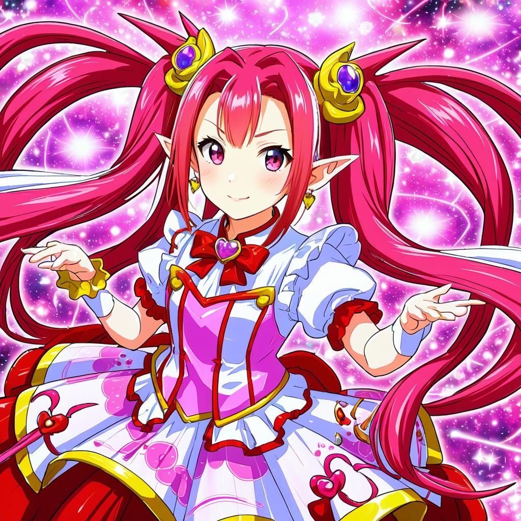 Anime-style illustration of a magical girl with very long pink and red hair styled in quad tails, red eyes, and pointy ears. She wears a detailed magical girl outfit featuring a white puffed sleeve dress with red and purple accents, a large pink bow with a gem at the center, and frilled skirt layers. The vibrant purple and blue starry background includes glowing magical symbols adding to the fantasy theme.