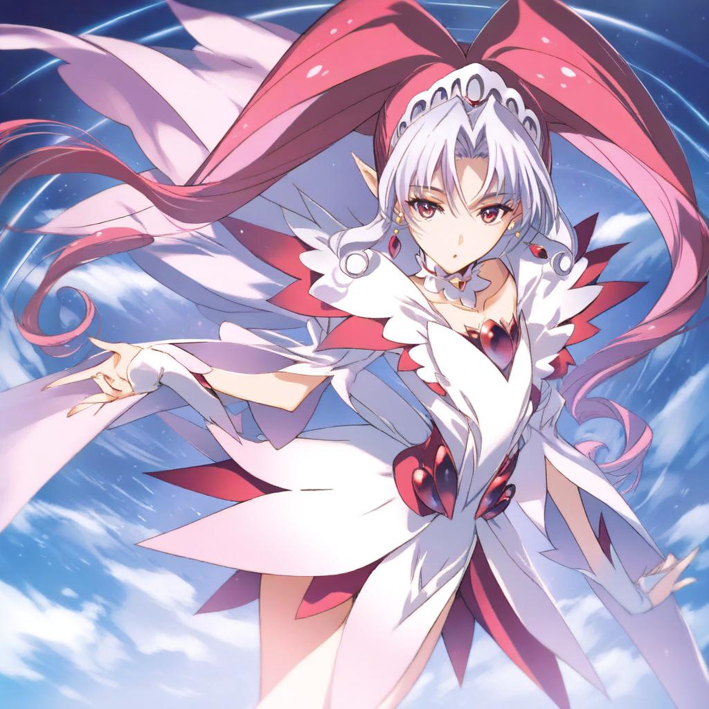 Akagi towa, go! princess precure, 1girl, pointy ears, quad tails, red eyes, long hair, pink hair, red hair, white hair, very long hair, earrings, magical girl, by artist terazip, anime